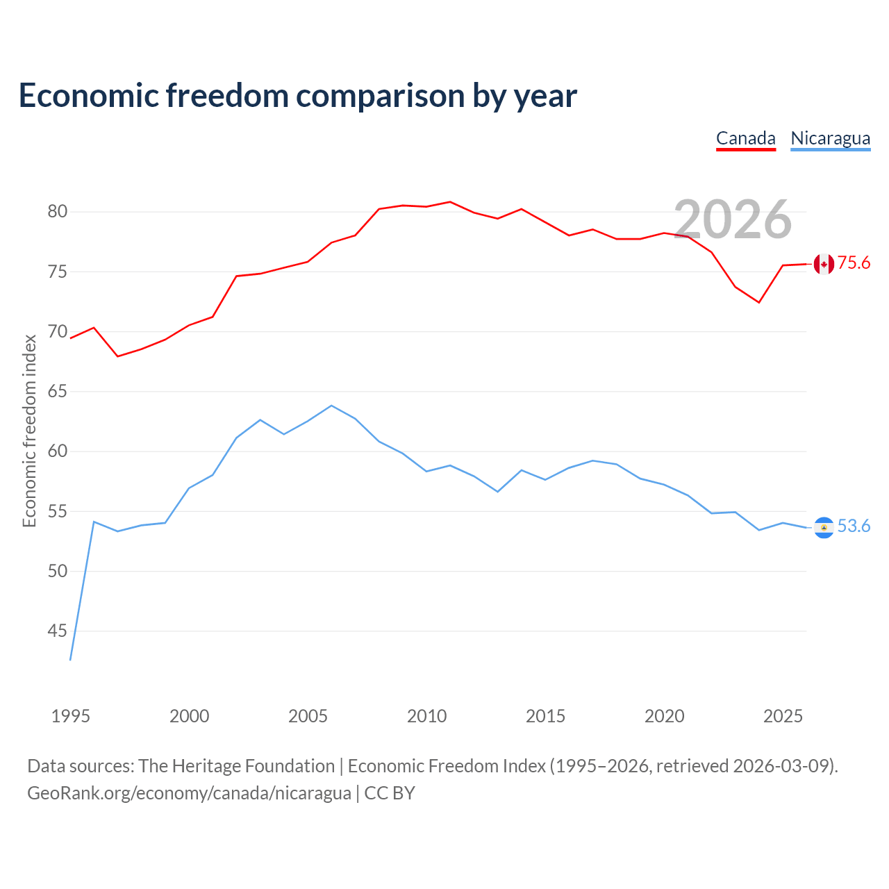 Data sources: The Heritage Foundation | Economic Freedom Index (1995–2026, retrieved 2026-03-09).