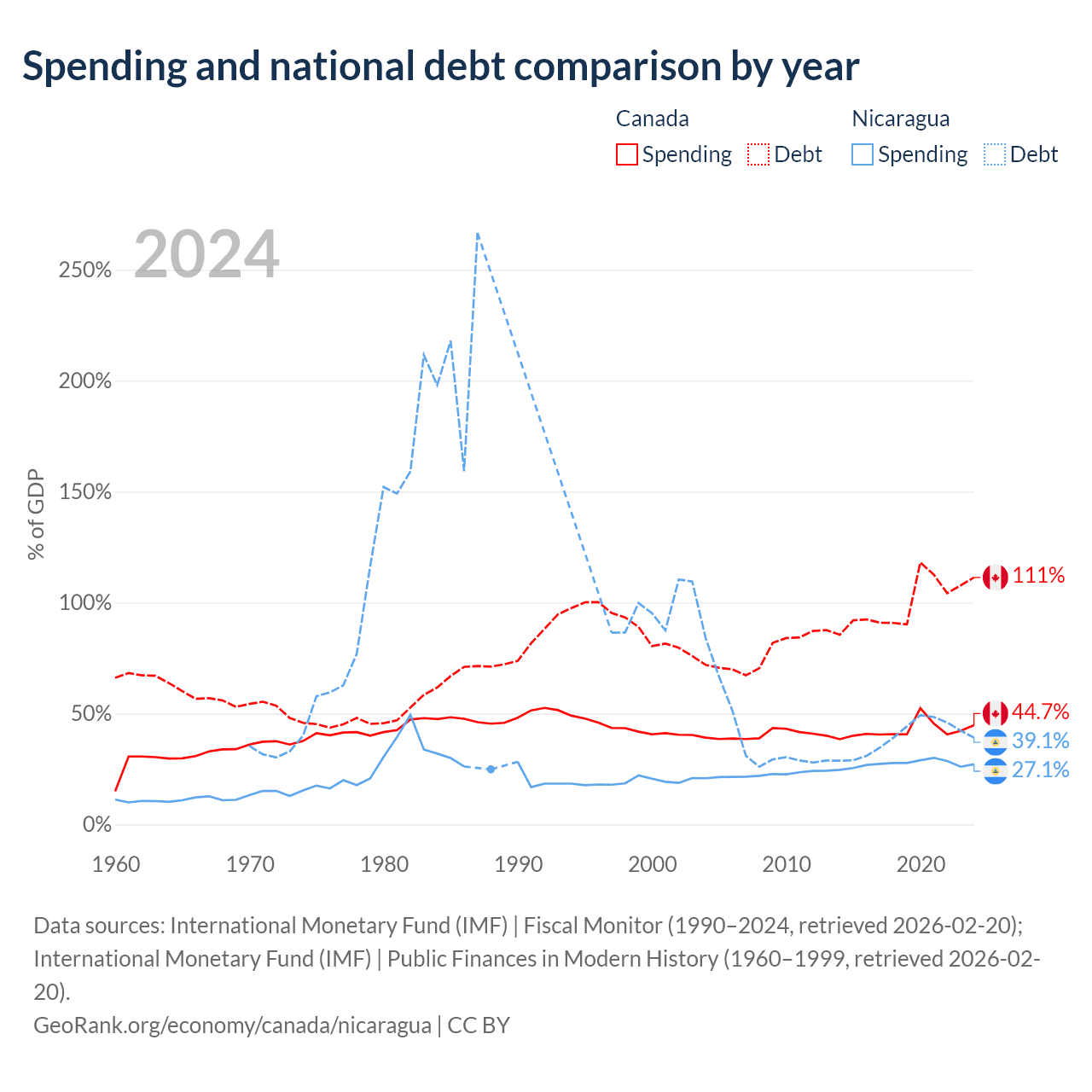 Canada has $2.5T in government debt (111.3% of GDP), compared to $7.71B (39.1% of GDP) in Nicaragua.