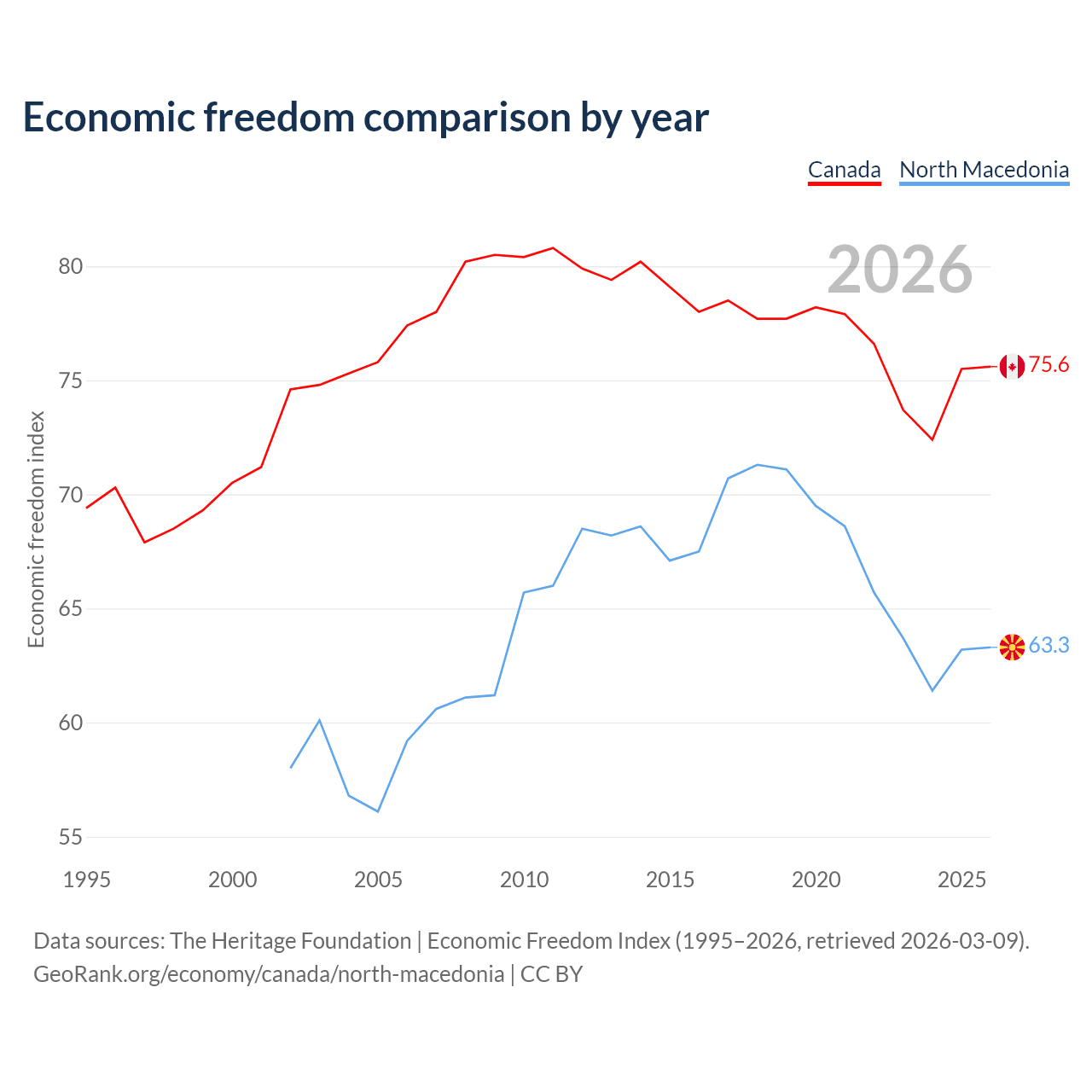 The Economic Freedom Index for Canada is 75.6, ranking 17/197, compared to 63.3 for North Macedonia, ranking 81/197. The chart above displays a comparison of annual changes in economic freedom indexes.