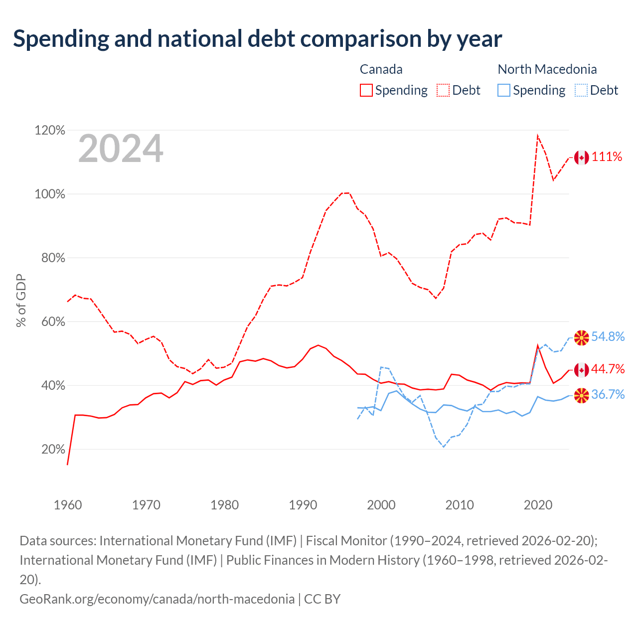 Canada has $2.5T in government debt (111.3% of GDP), compared to $9.3B (54.8% of GDP) in North Macedonia.