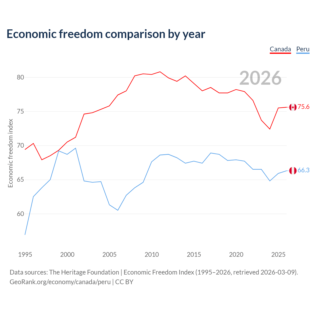 The Economic Freedom Index for Canada is 75.6, ranking 17/197, compared to 66.3 for Peru, ranking 62/197. The chart above displays a comparison of annual changes in economic freedom indexes.