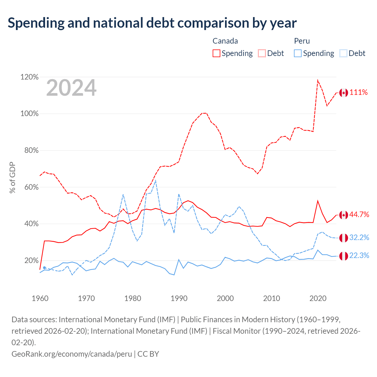 Canada has $2.5T in government debt (111.3% of GDP), compared to $93B (32.2% of GDP) in Peru.
