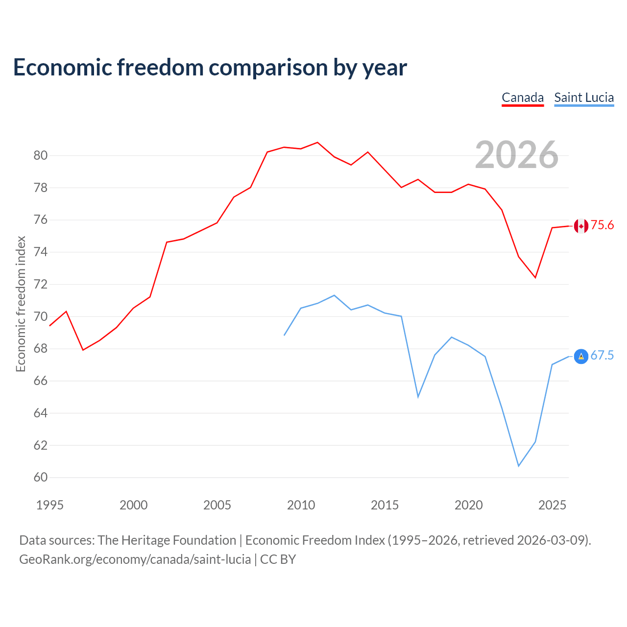 The Economic Freedom Index for Canada is 75.6, ranking 17/197, compared to 67.5 for Saint Lucia, ranking 57/197. The chart above displays a comparison of annual changes in economic freedom indexes.