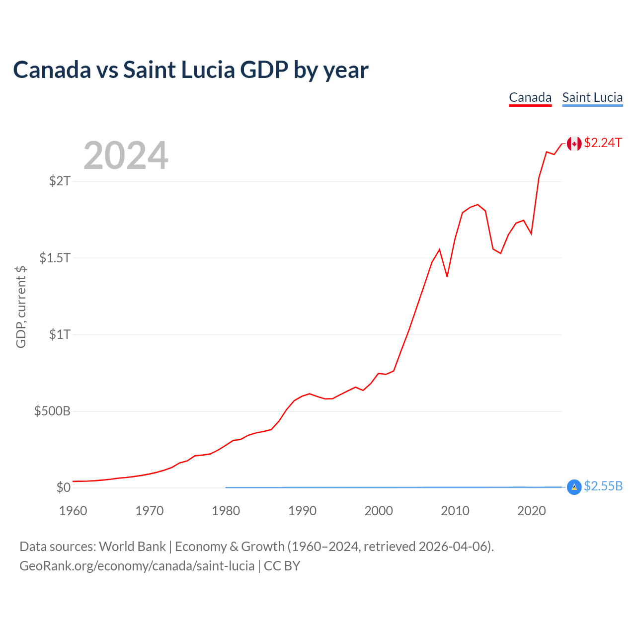 Canada has a GDP of $2.24T compared to $2.55B for Saint Lucia, ranking 9/197 and 173/197 by economy size, respectively.