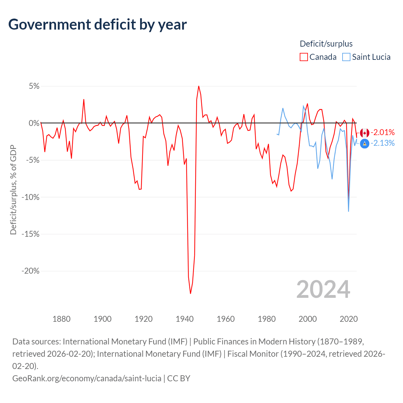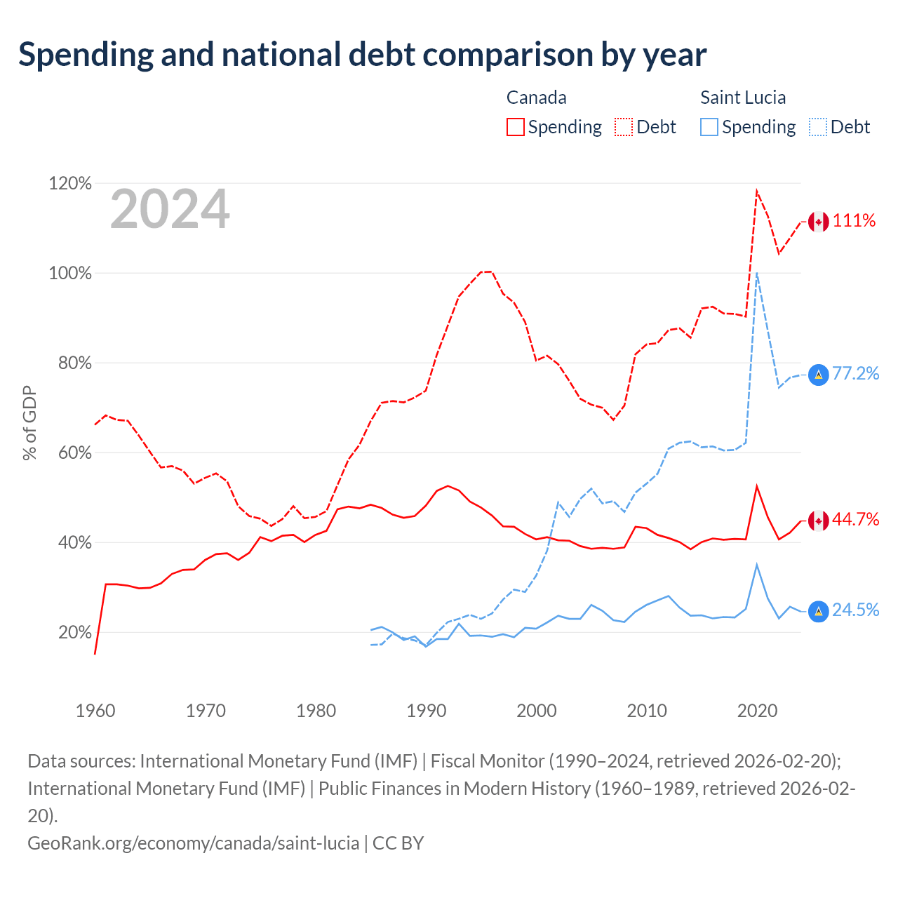 Canada has $2.5T in government debt (111.3% of GDP), compared to $1.97B (77.2% of GDP) in Saint Lucia.