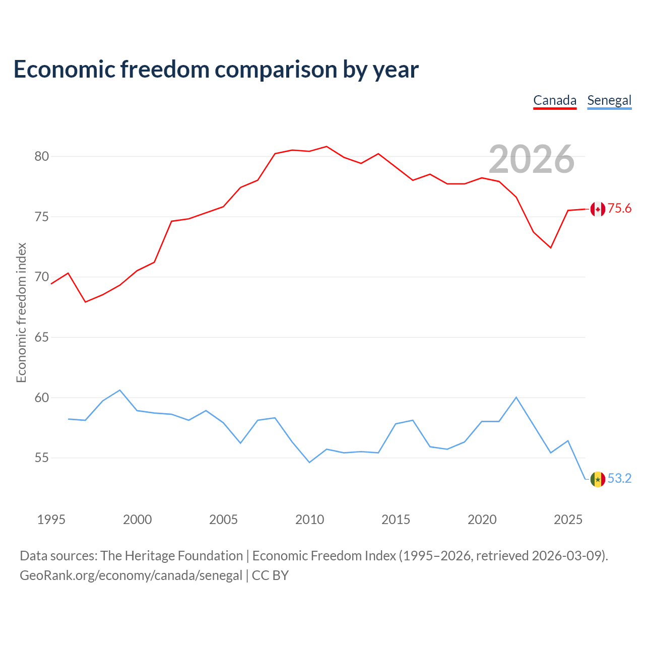 The Economic Freedom Index for Canada is 75.6, ranking 17/197, compared to 53.2 for Senegal, ranking 140/197. The chart above displays a comparison of annual changes in economic freedom indexes.