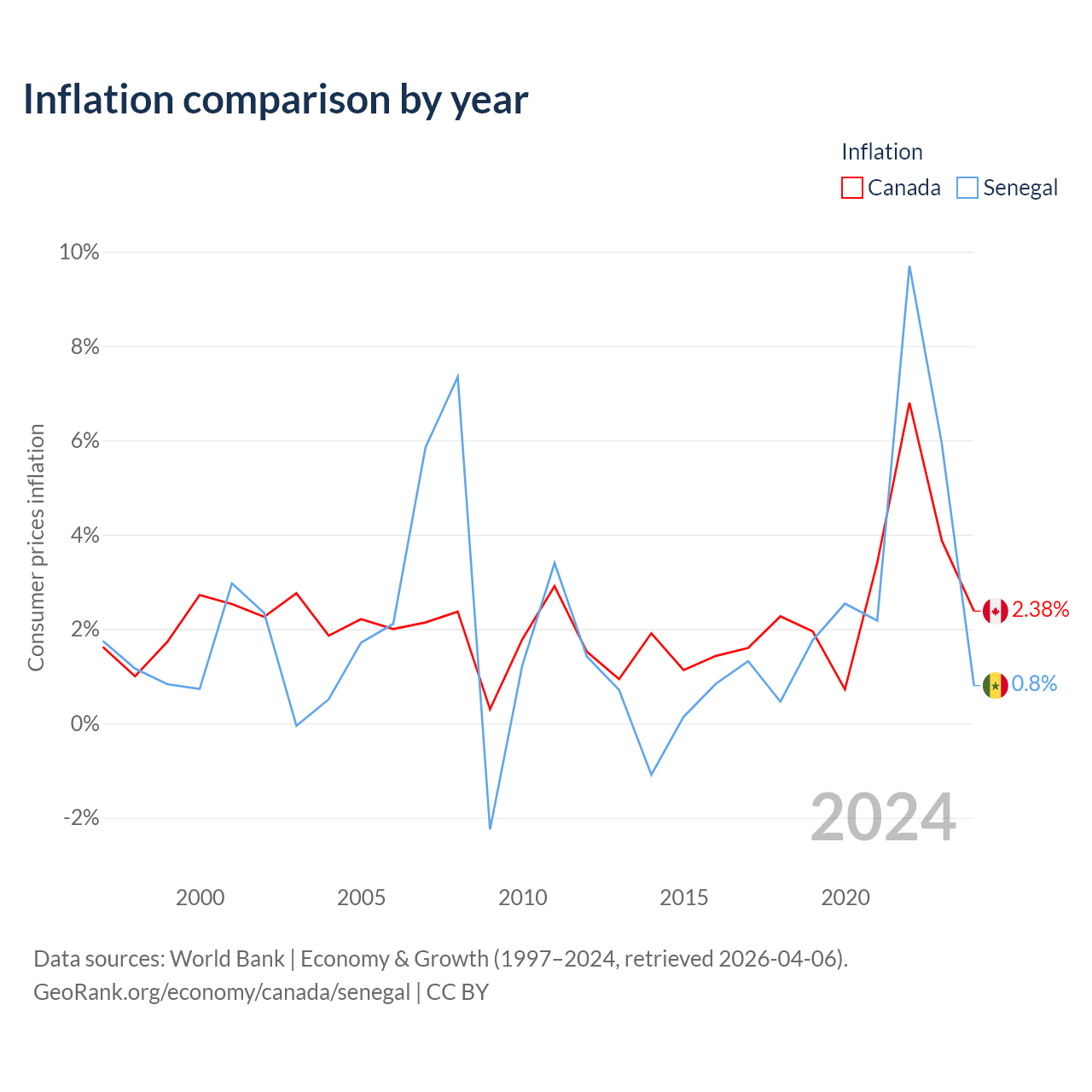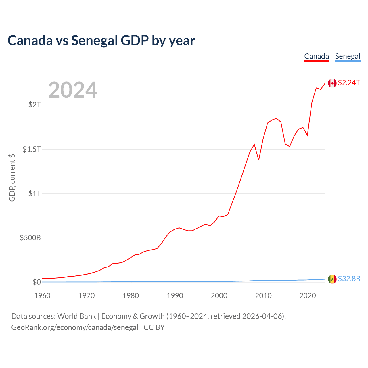 Canada has a GDP of $2.24T compared to $32.8B for Senegal, ranking 9/197 and 109/197 by economy size, respectively.