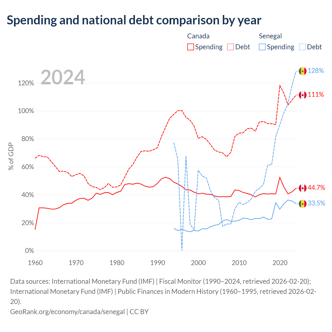 Canada has $2.5T in government debt (111.3% of GDP), compared to $42.1B (128.4% of GDP) in Senegal.