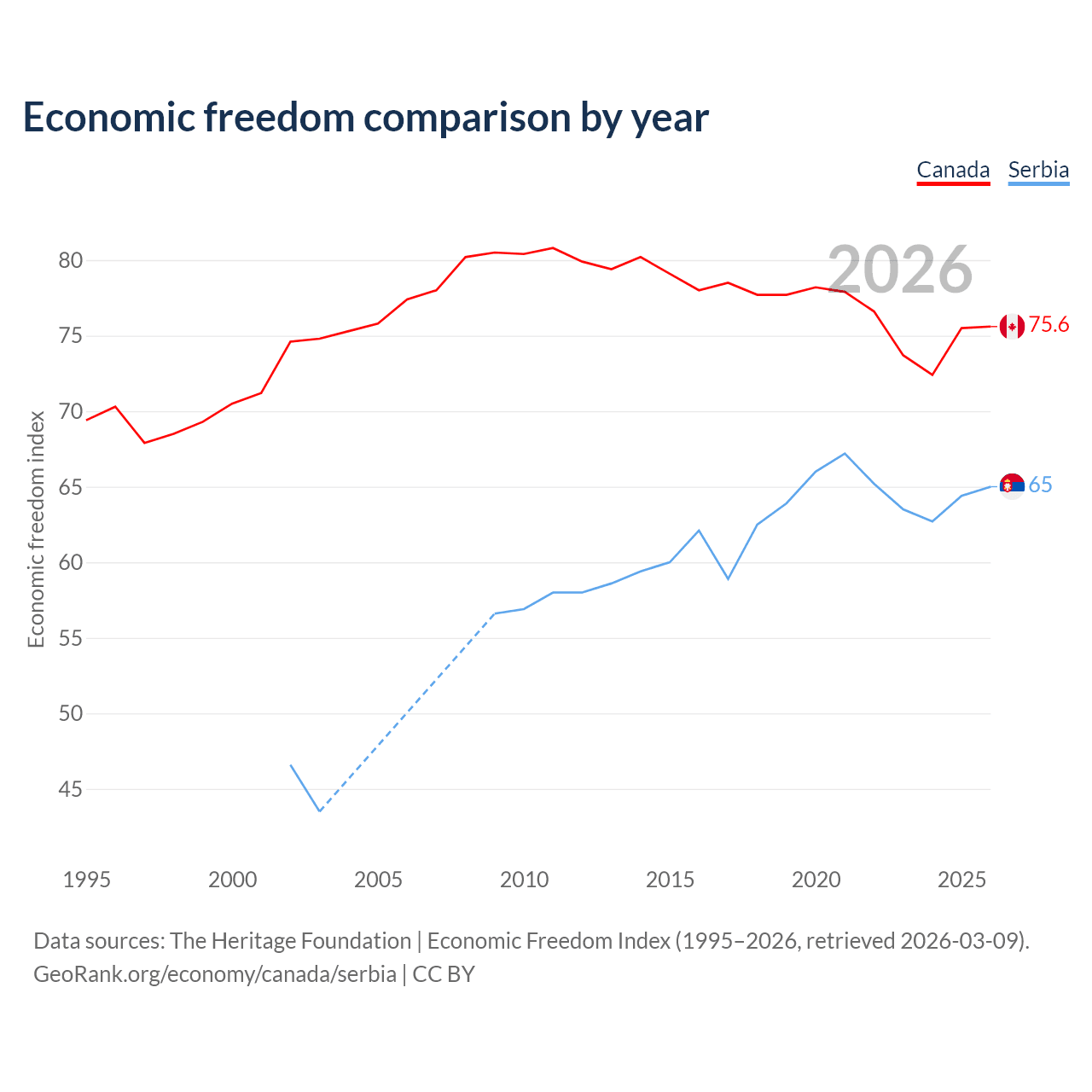 The Economic Freedom Index for Canada is 75.6, ranking 17/197, compared to 65 for Serbia, ranking 68/197. The chart above displays a comparison of annual changes in economic freedom indexes.
