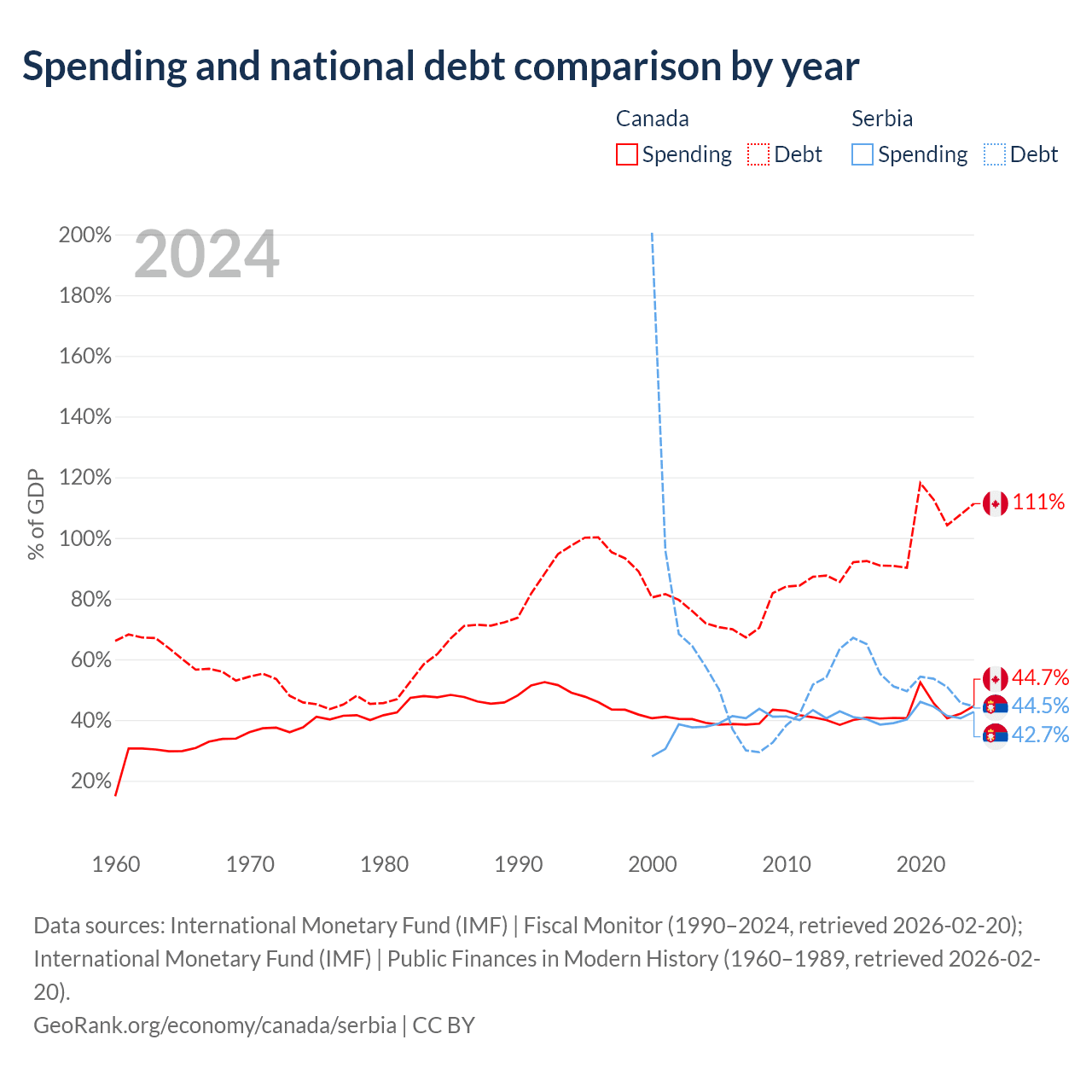 Canada has $2.5T in government debt (111.3% of GDP), compared to $40.1B (44.5% of GDP) in Serbia.