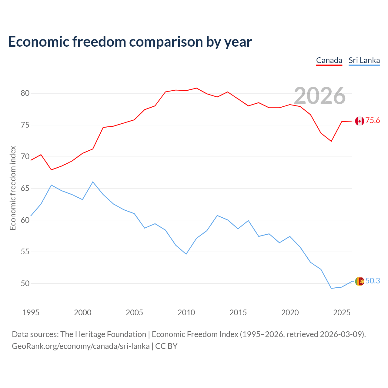 The Economic Freedom Index for Canada is 75.6, ranking 17/197, compared to 50.3 for Sri Lanka, ranking 162/197. The chart above displays a comparison of annual changes in economic freedom indexes.