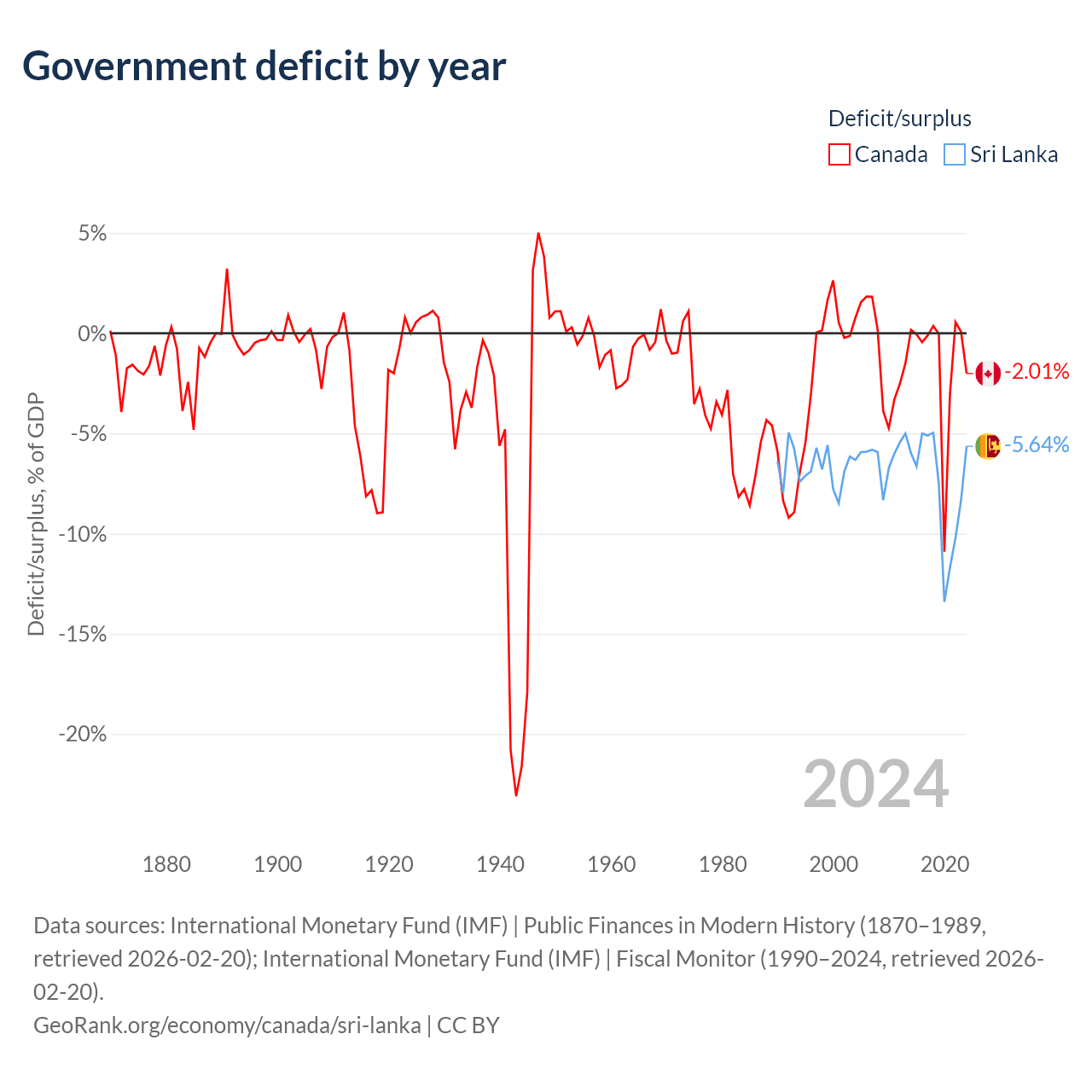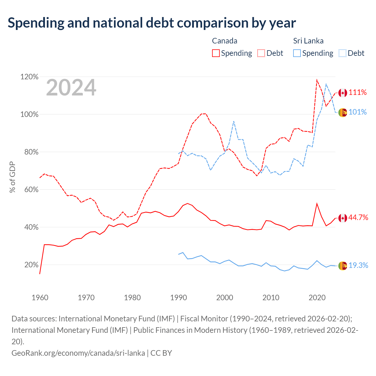 Canada has $2.5T in government debt (111.3% of GDP), compared to $99.8B (100.8% of GDP) in Sri Lanka.