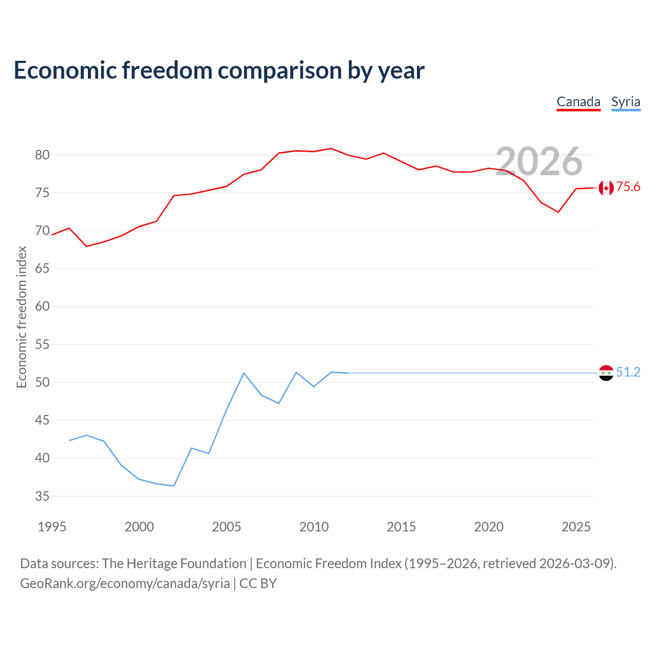 The Economic Freedom Index for Canada is 75.6, ranking 17/197, compared to 51.2 for Syria, ranking 155/197. The chart above displays a comparison of annual changes in economic freedom indexes.