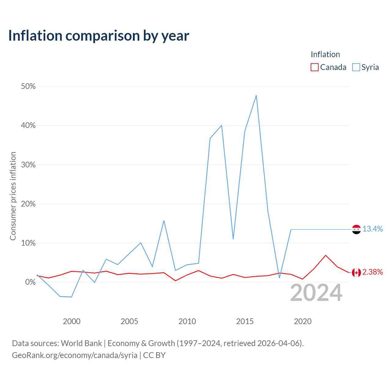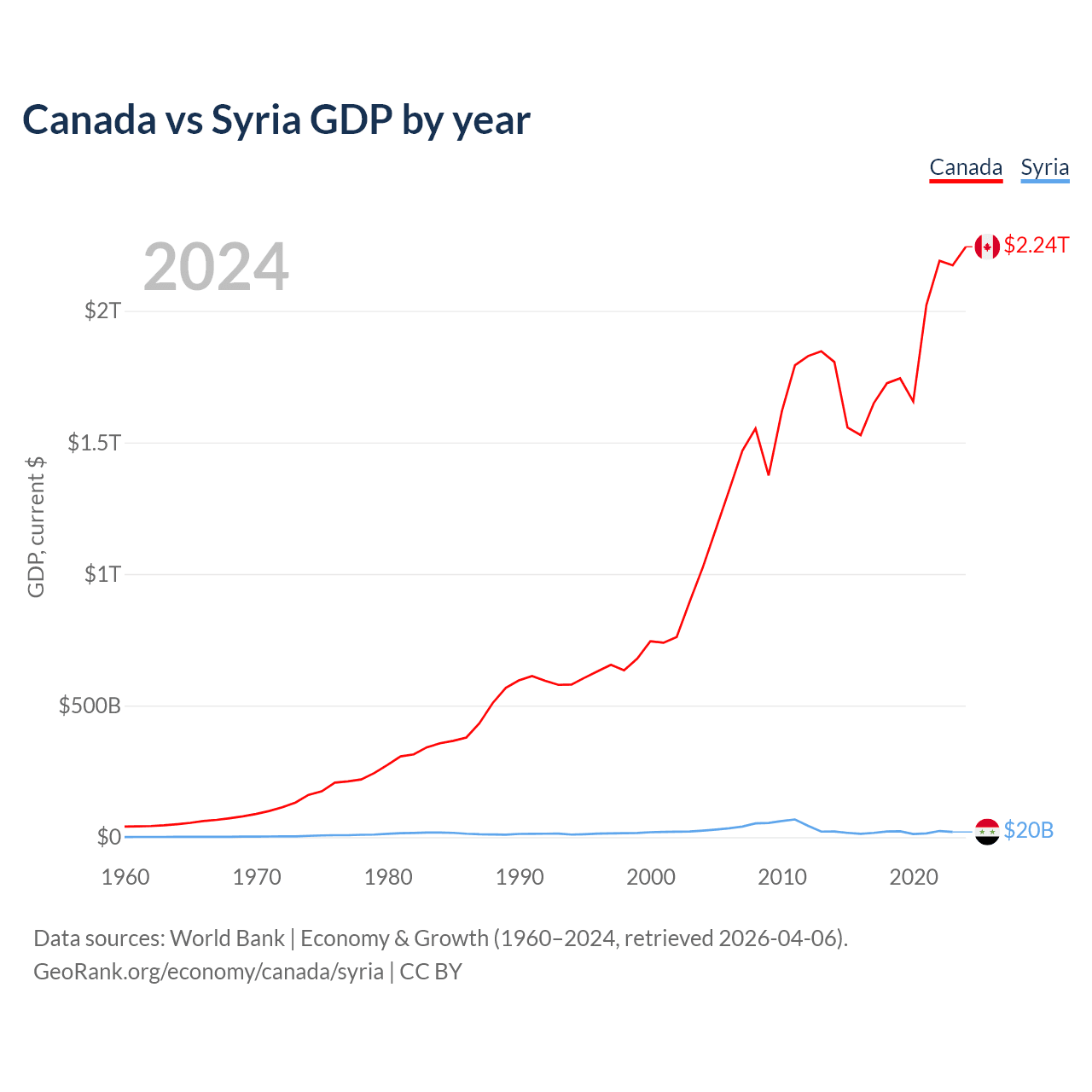 Canada has a GDP of $2.24T compared to $20B for Syria, ranking 9/197 and 129/197 by economy size, respectively.