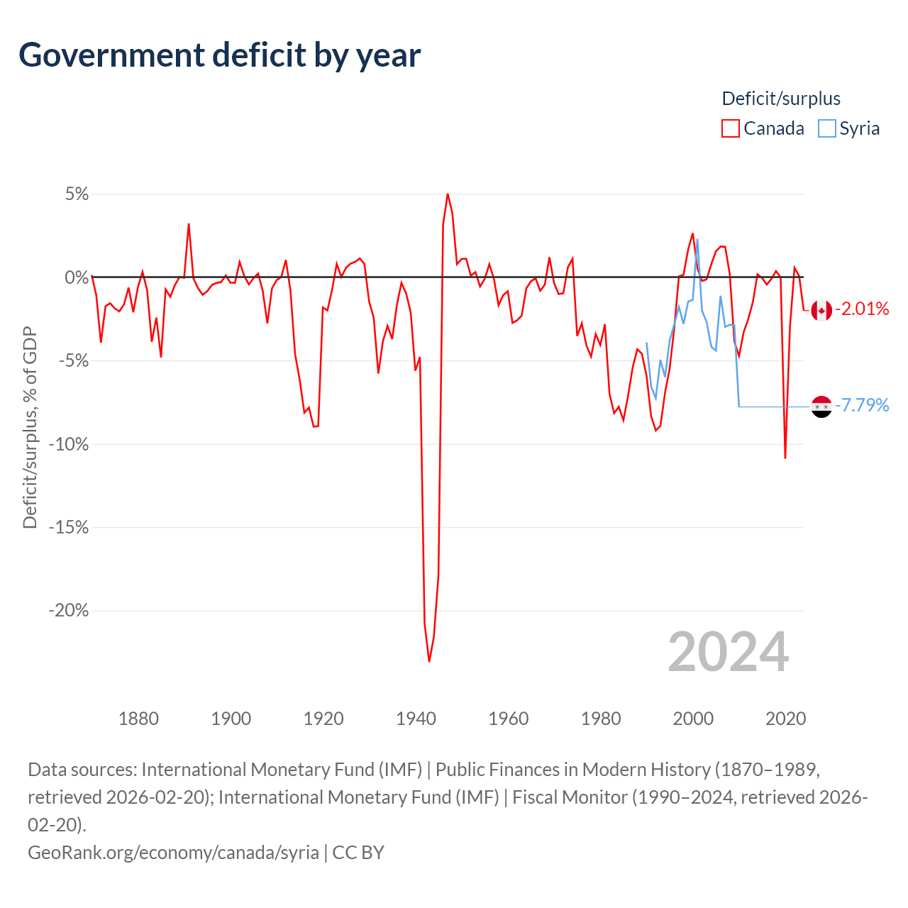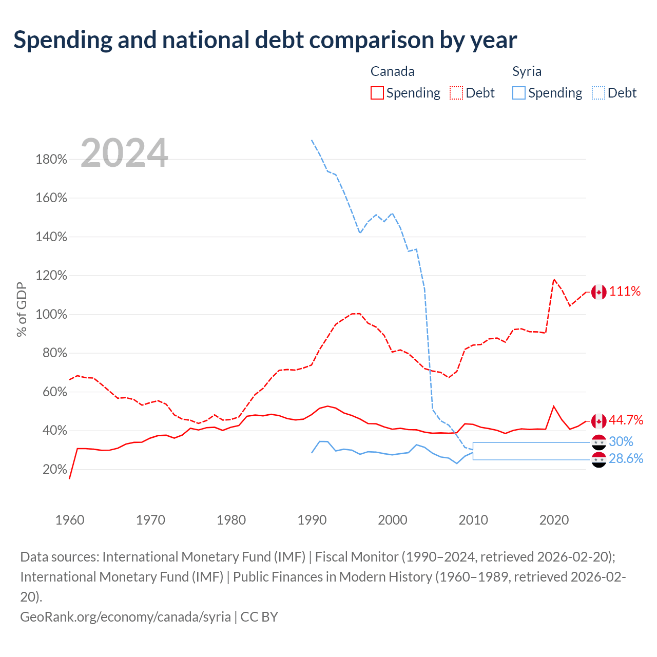 Canada has $2.5T in government debt (111.3% of GDP), compared to $18.4B (30% of GDP) in Syria.