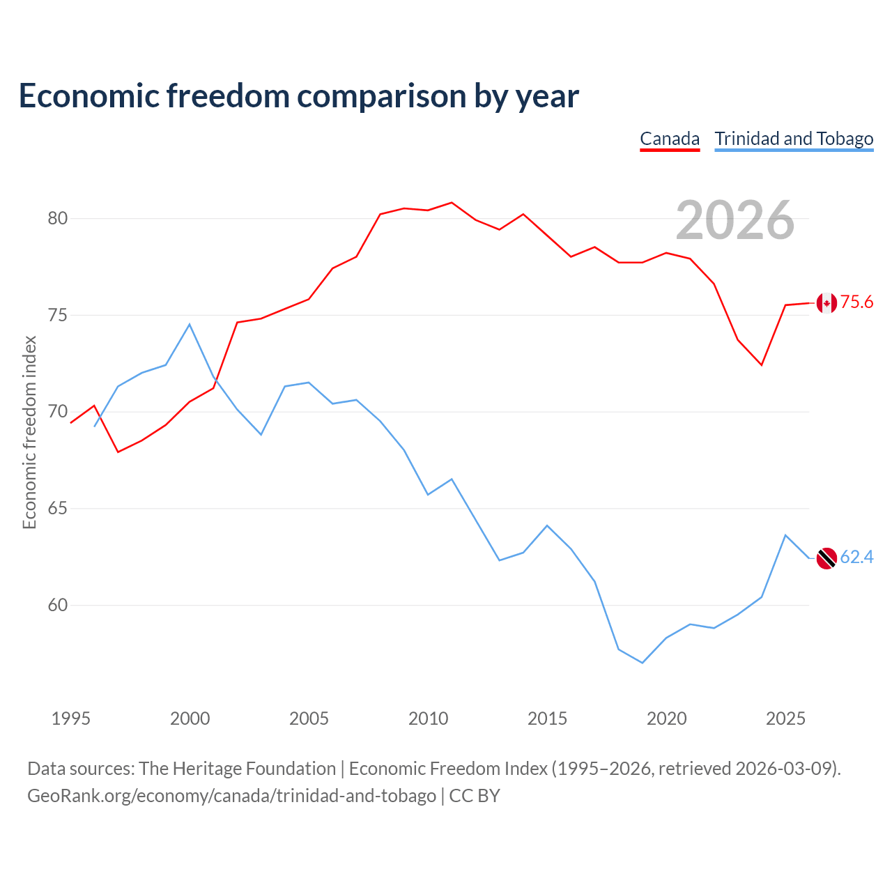The Economic Freedom Index for Canada is 75.6, ranking 17/197, compared to 62.4 for Trinidad and Tobago, ranking 87/197. The chart above displays a comparison of annual changes in economic freedom indexes.