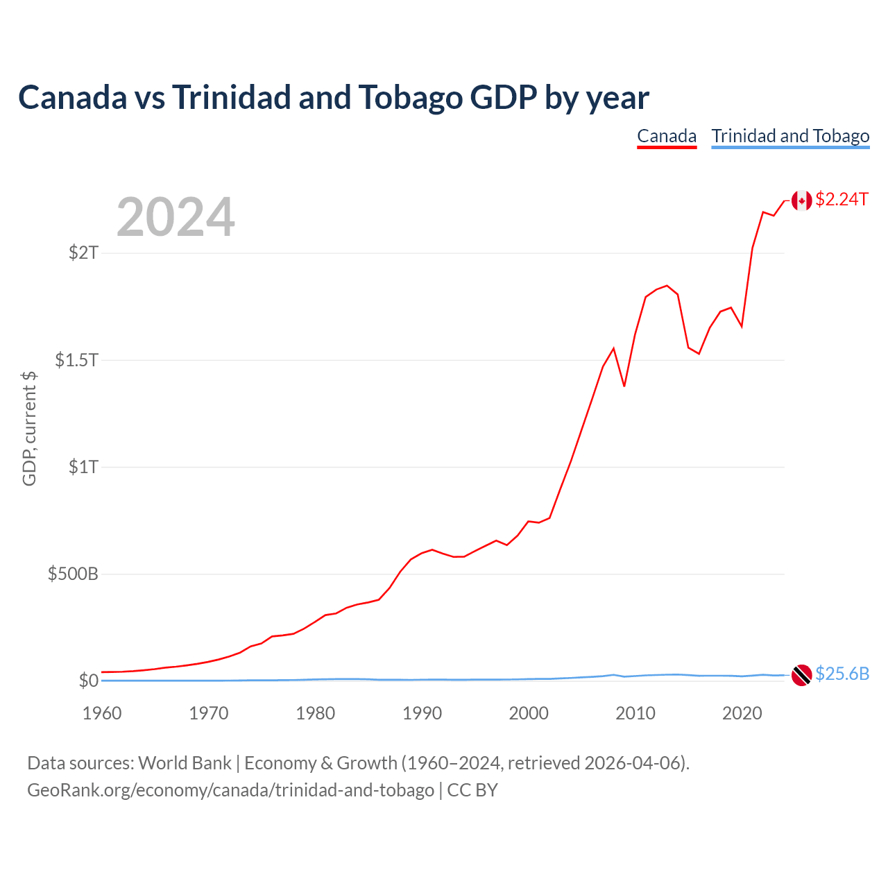 Canada has a GDP of $2.24T compared to $25.6B for Trinidad and Tobago, ranking 9/197 and 115/197 by economy size, respectively.