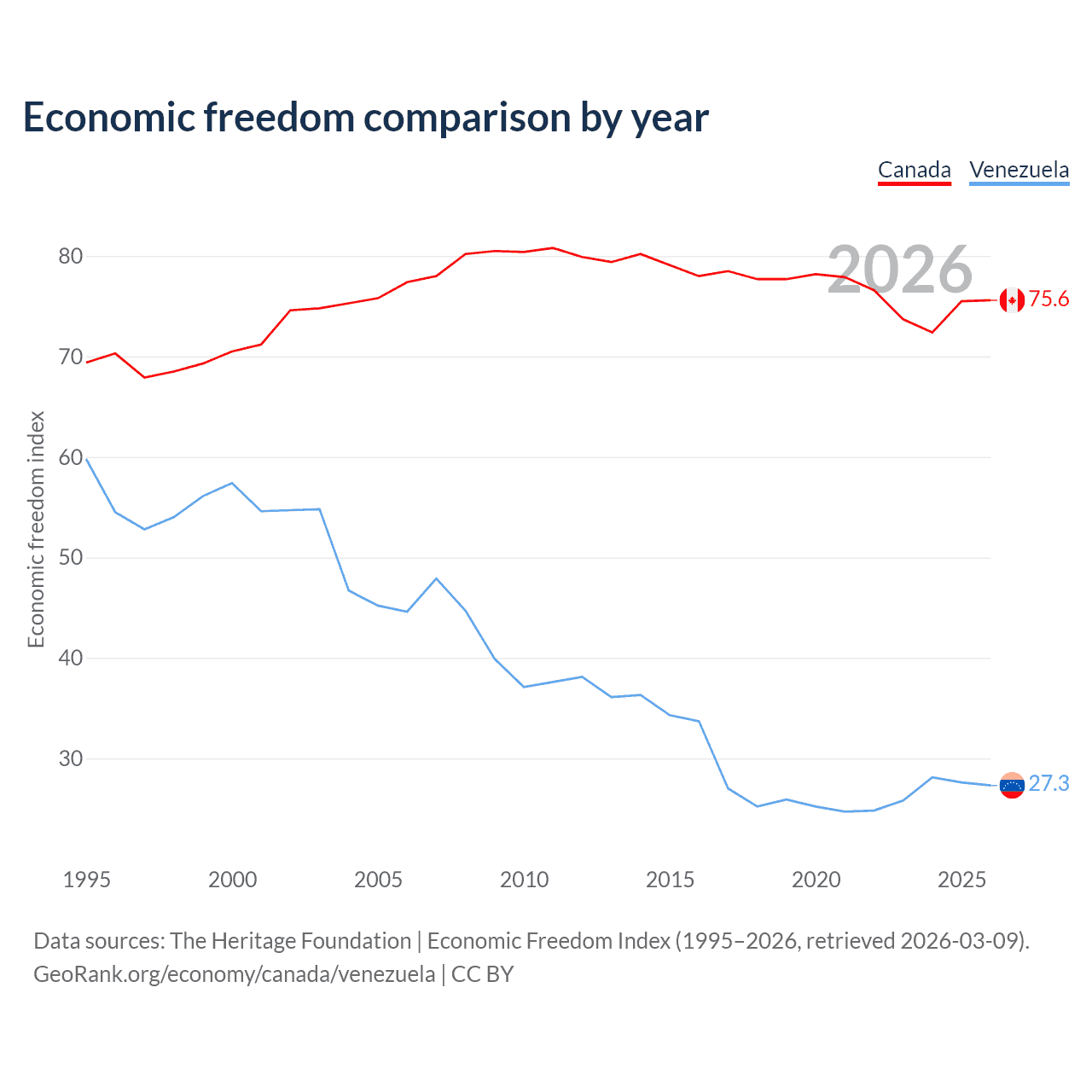 The Economic Freedom Index for Canada is 75.6, ranking 17/197, compared to 27.3 for Venezuela, ranking 194/197. The chart above displays a comparison of annual changes in economic freedom indexes.