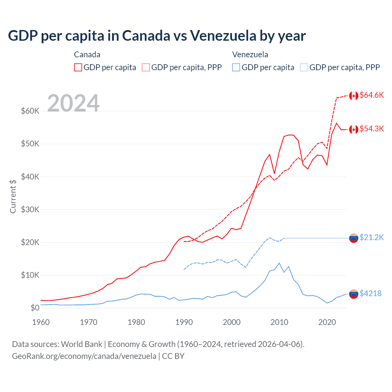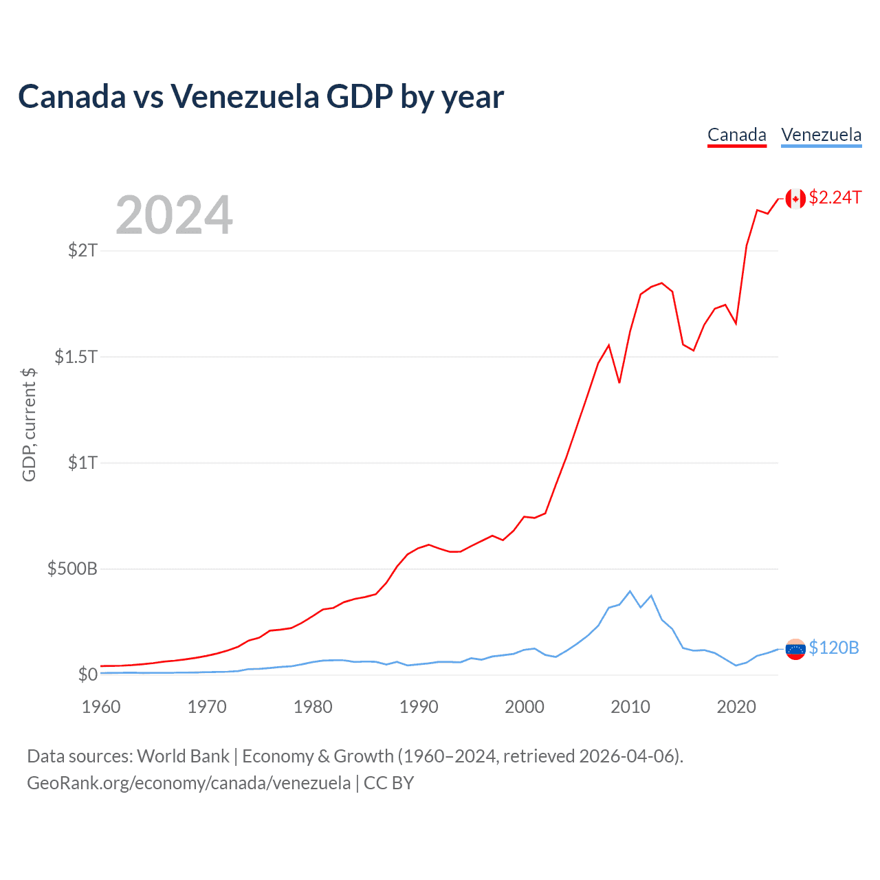 Canada has a GDP of $2.24T compared to $120B for Venezuela, ranking 9/197 and 65/197 by economy size, respectively.