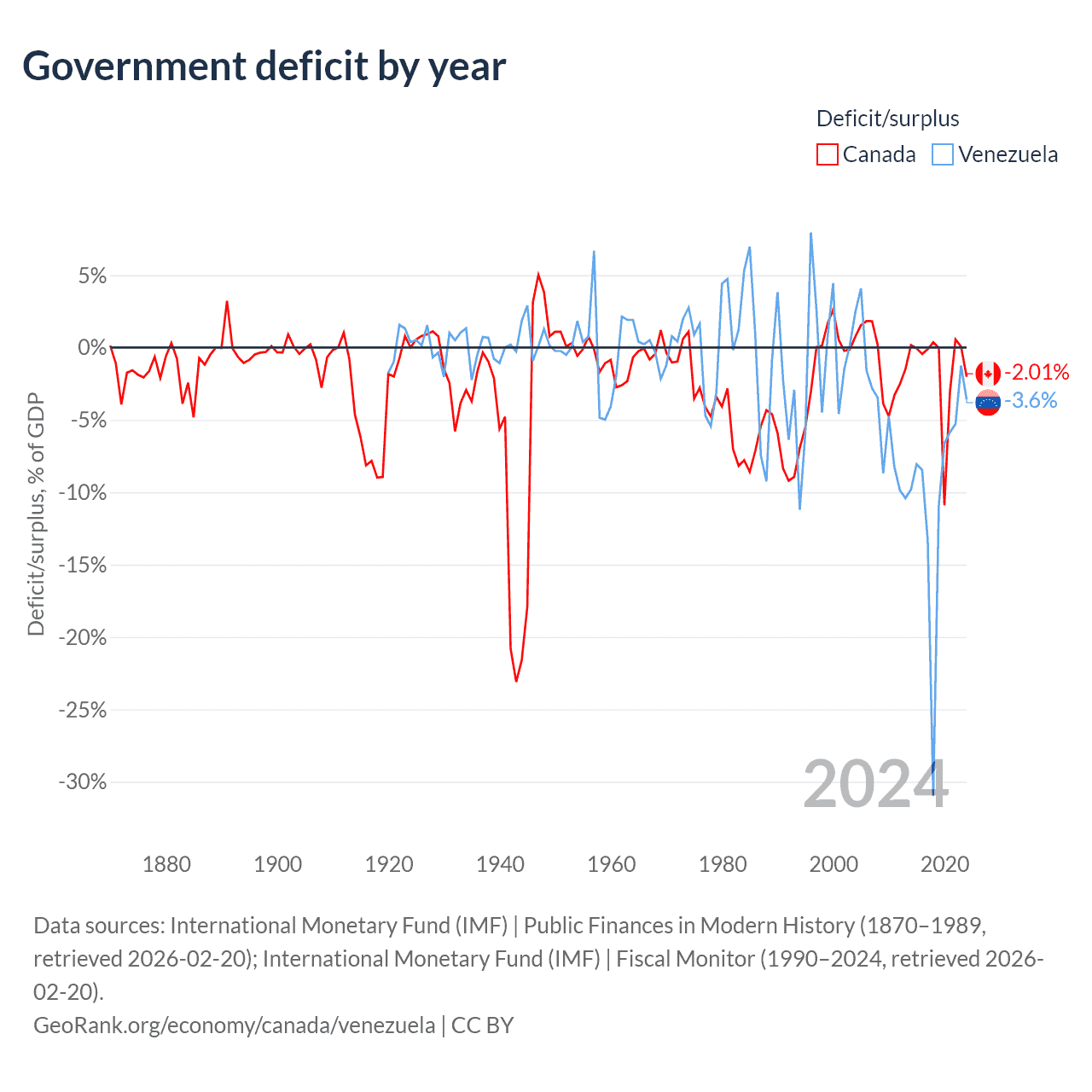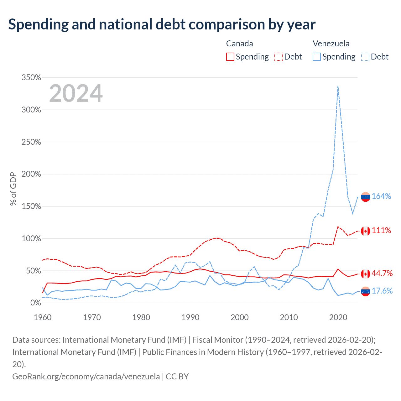 Canada has $2.5T in government debt (111.3% of GDP), compared to $197B (164.3% of GDP) in Venezuela.