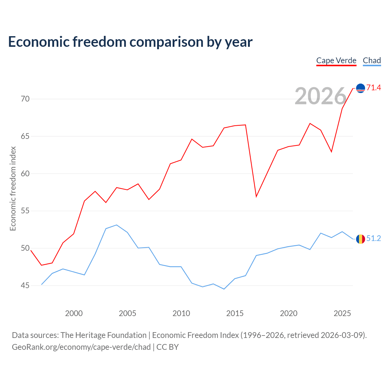 The Economic Freedom Index for Cape Verde is 71.4, ranking 32/197, compared to 51.2 for Chad, ranking 154/197. The chart above displays a comparison of annual changes in economic freedom indexes.