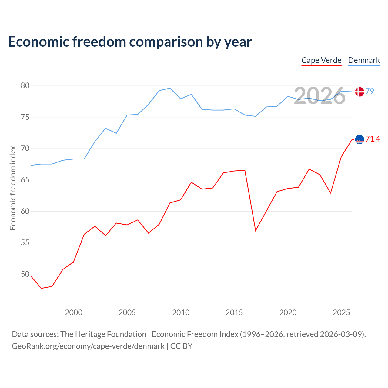 The Economic Freedom Index for Cape Verde is 71.4, ranking 32/197, compared to 79 for Denmark, ranking 8/197. The chart above displays a comparison of annual changes in economic freedom indexes.