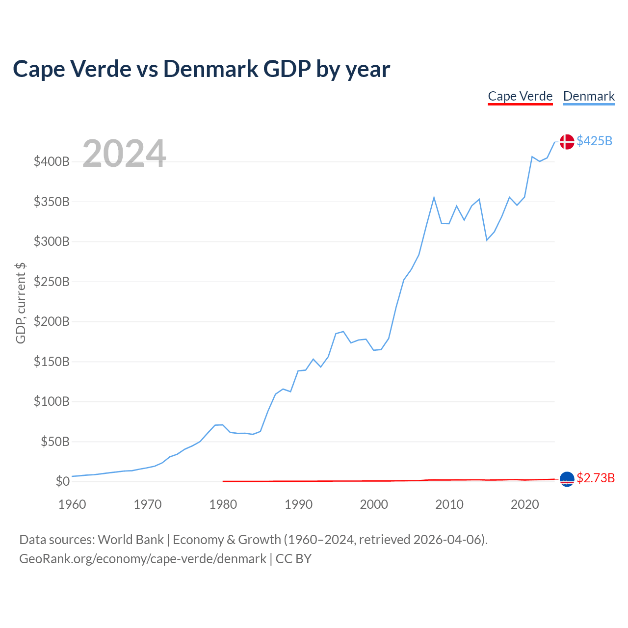 Cape Verde has a GDP of $2.73B compared to $425B for Denmark, ranking 172/197 and 37/197 by economy size, respectively.