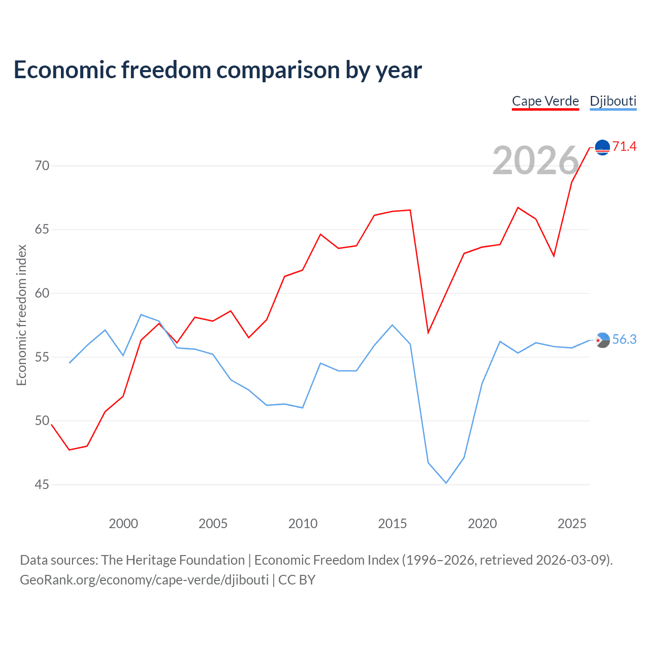 The Economic Freedom Index for Cape Verde is 71.4, ranking 32/197, compared to 56.3 for Djibouti, ranking 122/197. The chart above displays a comparison of annual changes in economic freedom indexes.