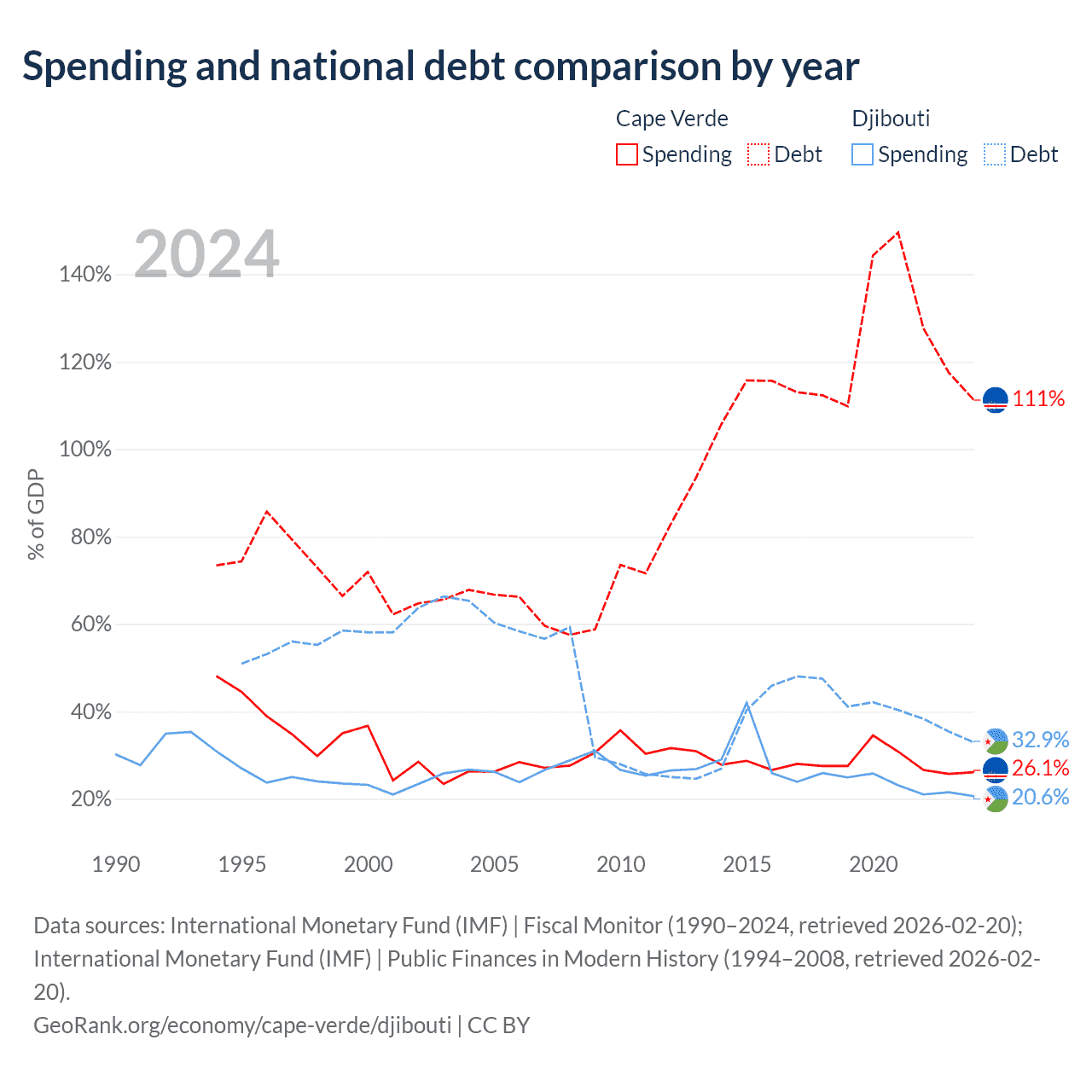 Cape Verde has $3.03B in government debt (111.2% of GDP), compared to $1.36B (32.9% of GDP) in Djibouti.