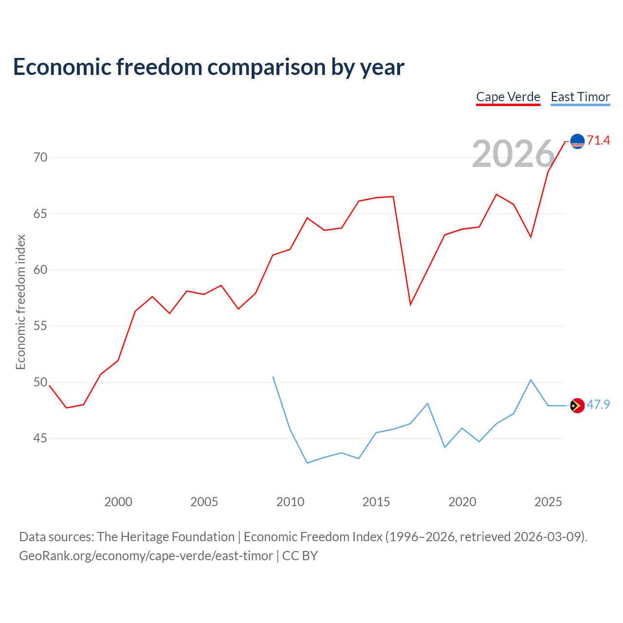 The Economic Freedom Index for Cape Verde is 71.4, ranking 32/197, compared to 47.9 for East Timor, ranking 173/197. The chart above displays a comparison of annual changes in economic freedom indexes.