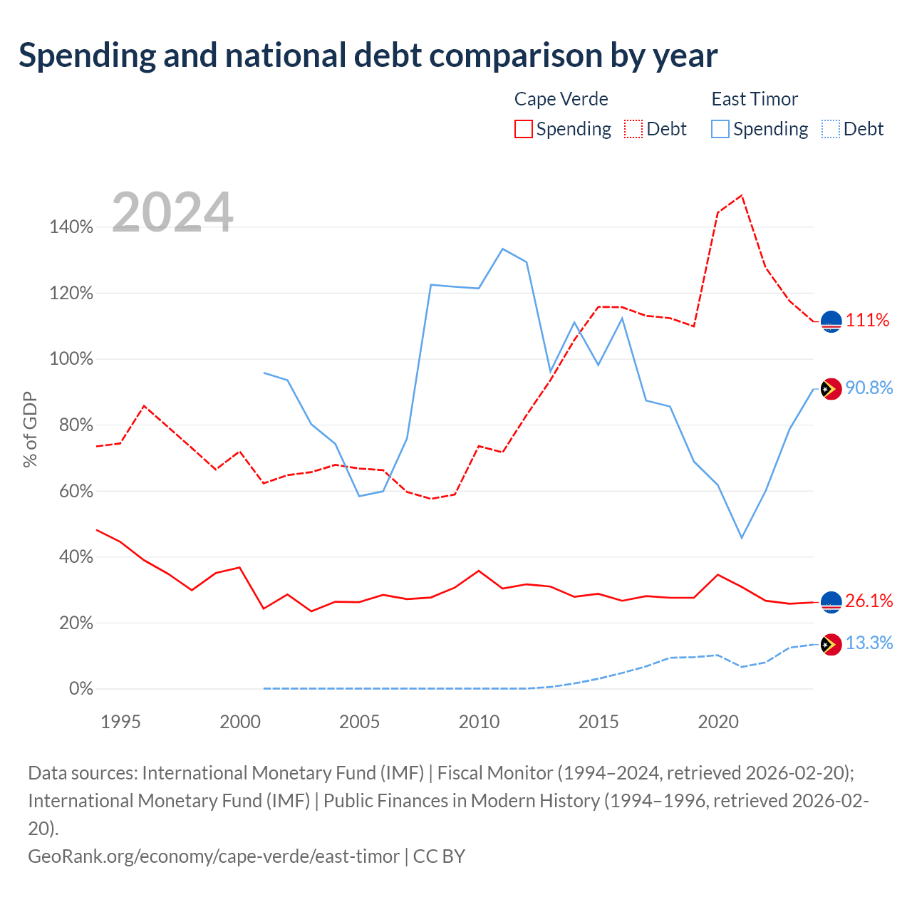 Cape Verde has $3.03B in government debt (111.2% of GDP), compared to $249M (13.3% of GDP) in East Timor.