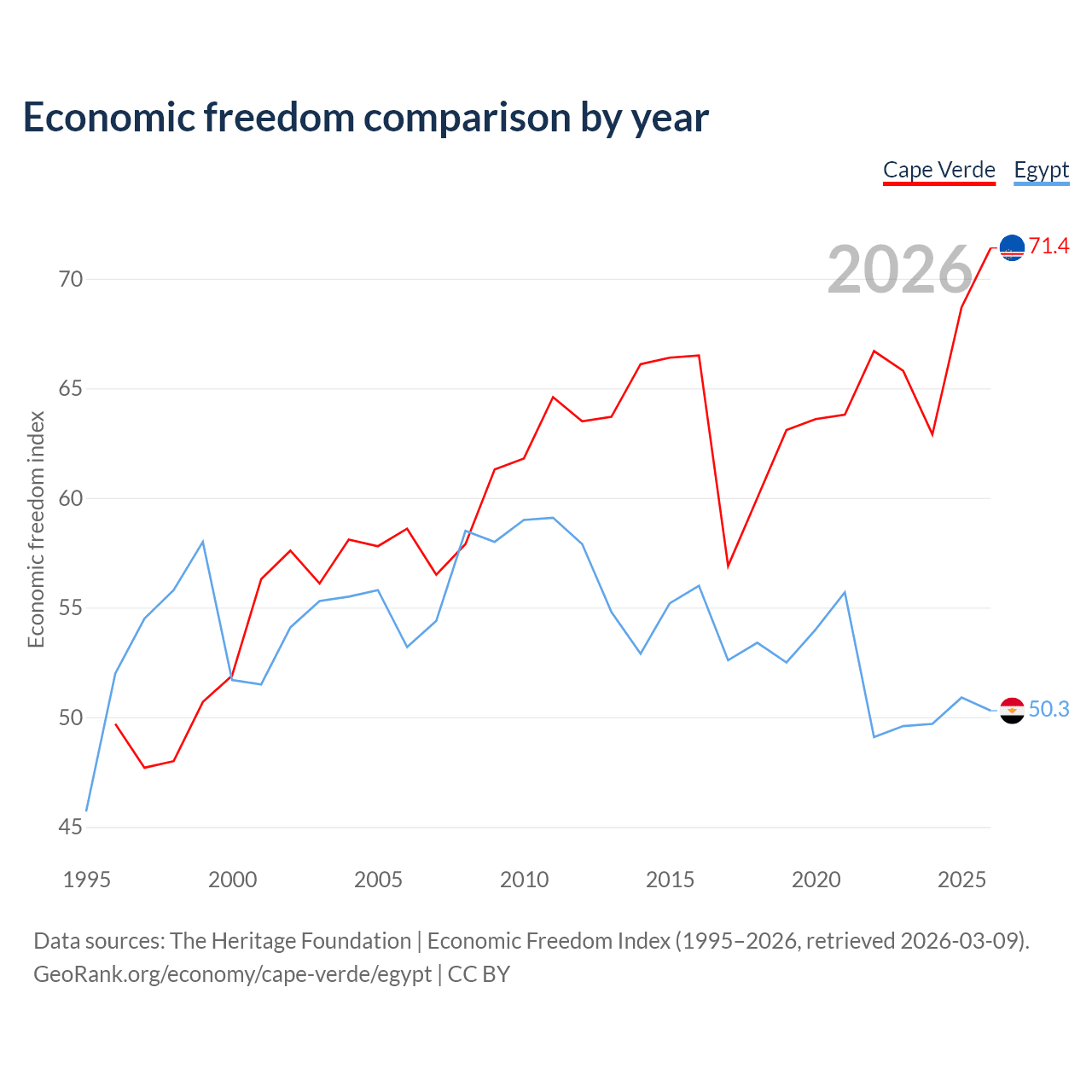 The Economic Freedom Index for Cape Verde is 71.4, ranking 32/197, compared to 50.3 for Egypt, ranking 160/197. The chart above displays a comparison of annual changes in economic freedom indexes.