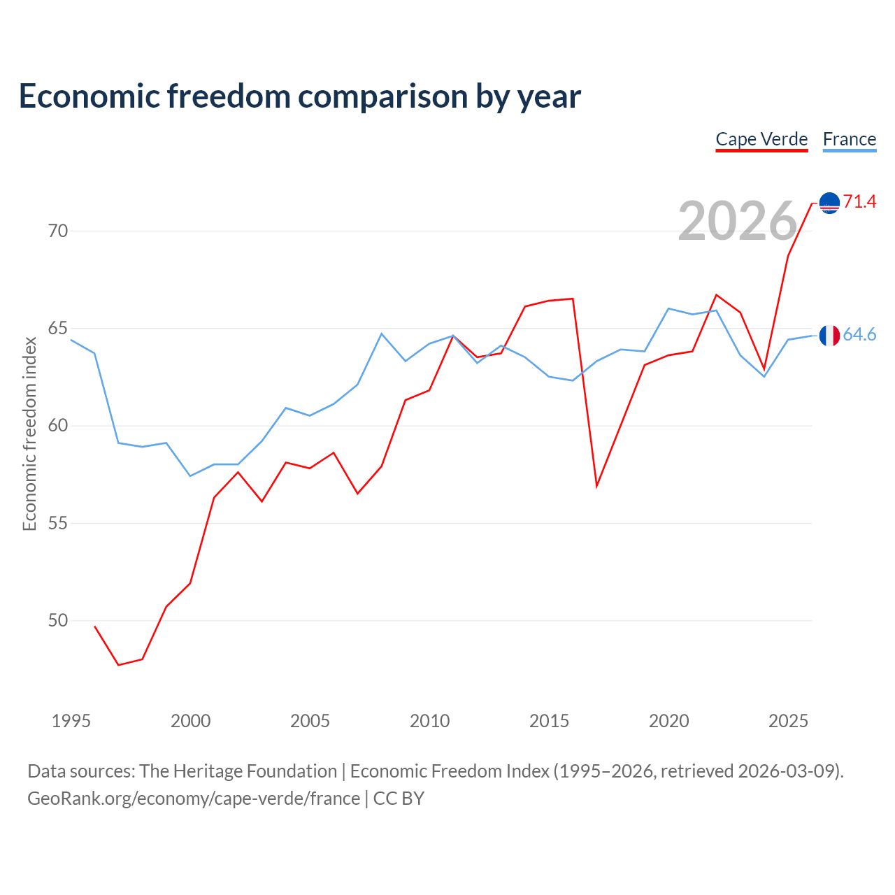 The Economic Freedom Index for Cape Verde is 71.4, ranking 32/197, compared to 64.6 for France, ranking 72/197. The chart above displays a comparison of annual changes in economic freedom indexes.