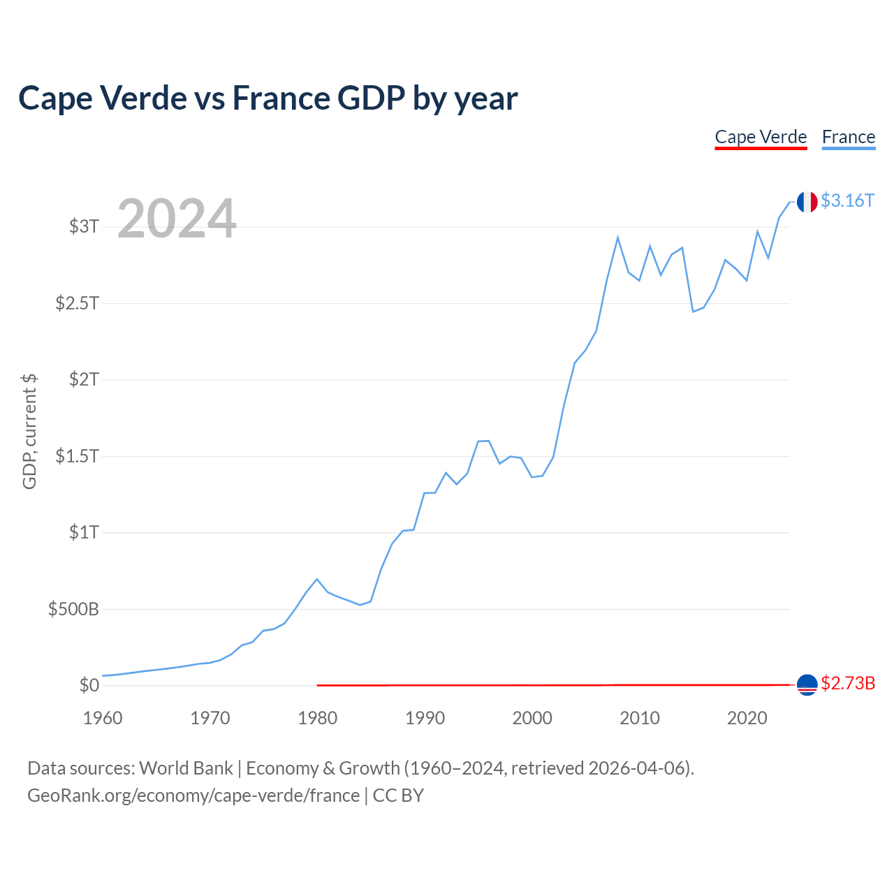 Cape Verde has a GDP of $2.73B compared to $3.16T for France, ranking 172/197 and 7/197 by economy size, respectively.