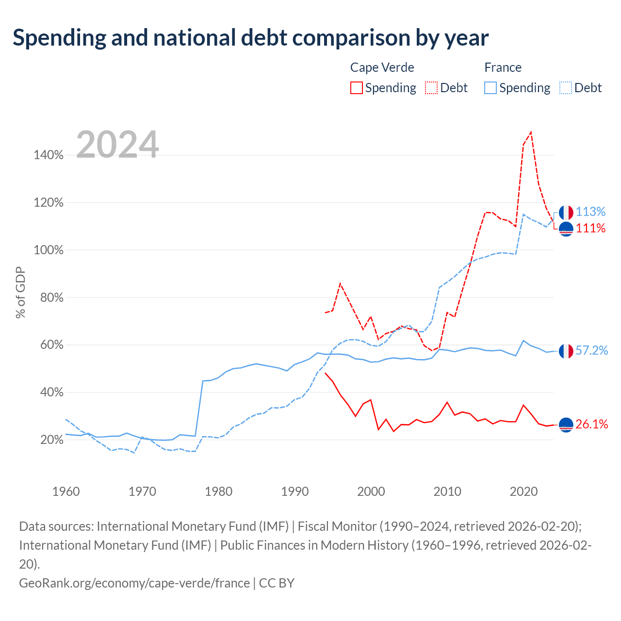 Cape Verde has $3.03B in government debt (111.2% of GDP), compared to $3.58T (113.1% of GDP) in France.