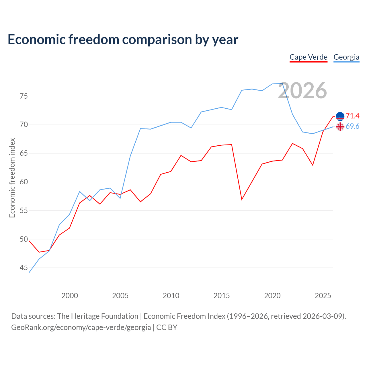 The Economic Freedom Index for Cape Verde is 71.4, ranking 32/197, compared to 69.6 for Georgia, ranking 41/197. The chart above displays a comparison of annual changes in economic freedom indexes.