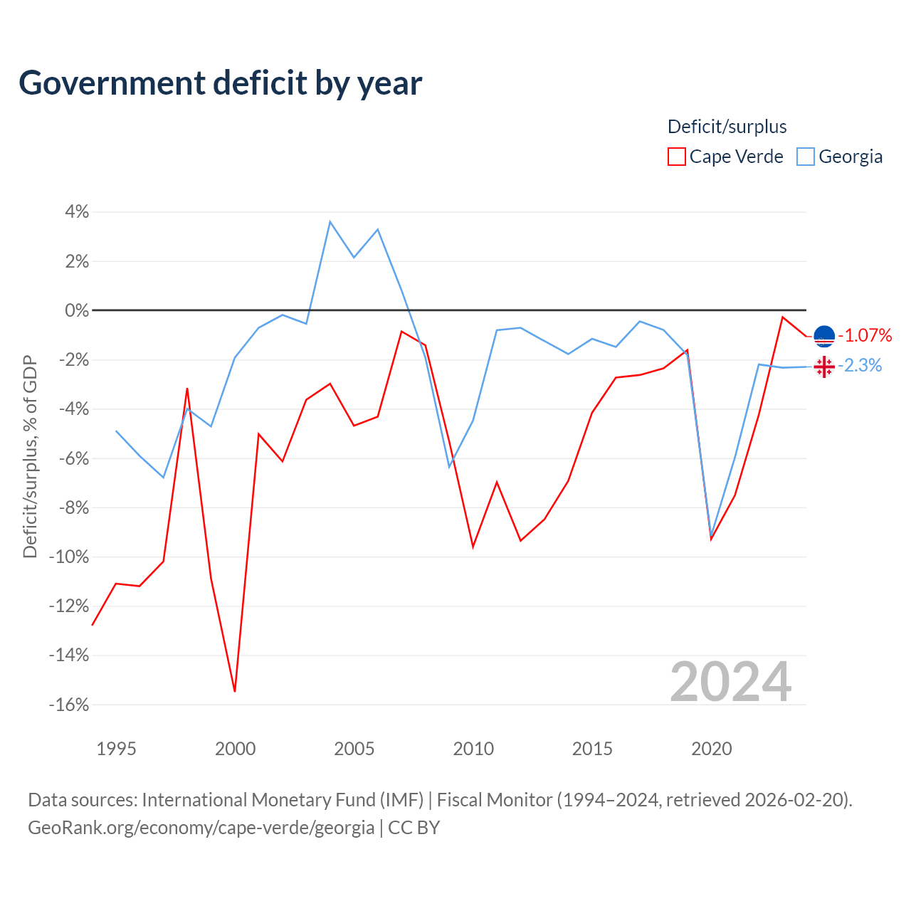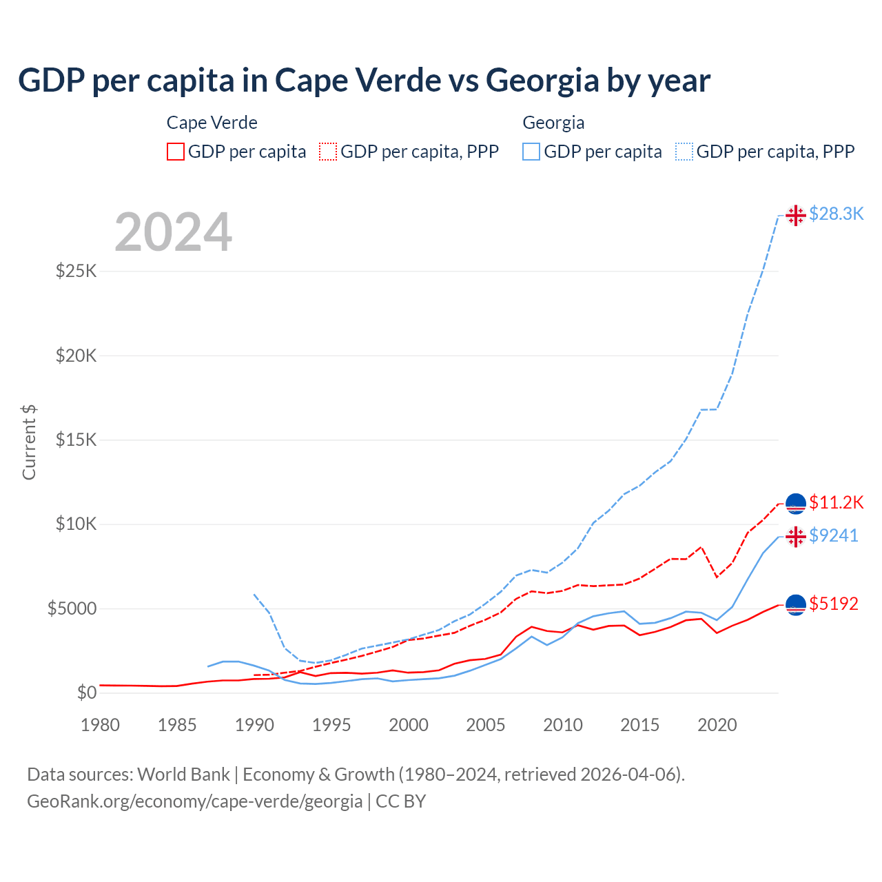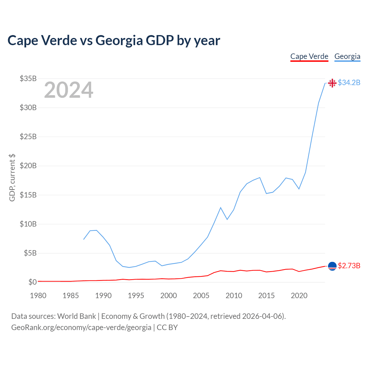 Cape Verde has a GDP of $2.73B compared to $34.2B for Georgia, ranking 172/197 and 107/197 by economy size, respectively.