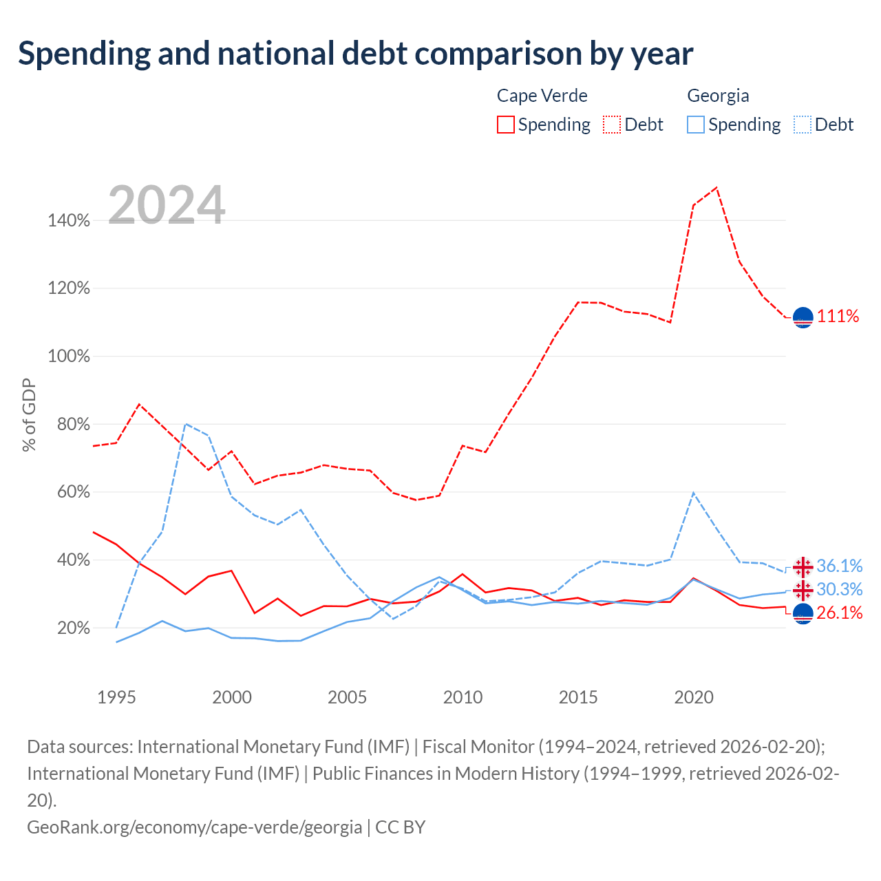 Cape Verde has $3.03B in government debt (111.2% of GDP), compared to $12.3B (36.1% of GDP) in Georgia.