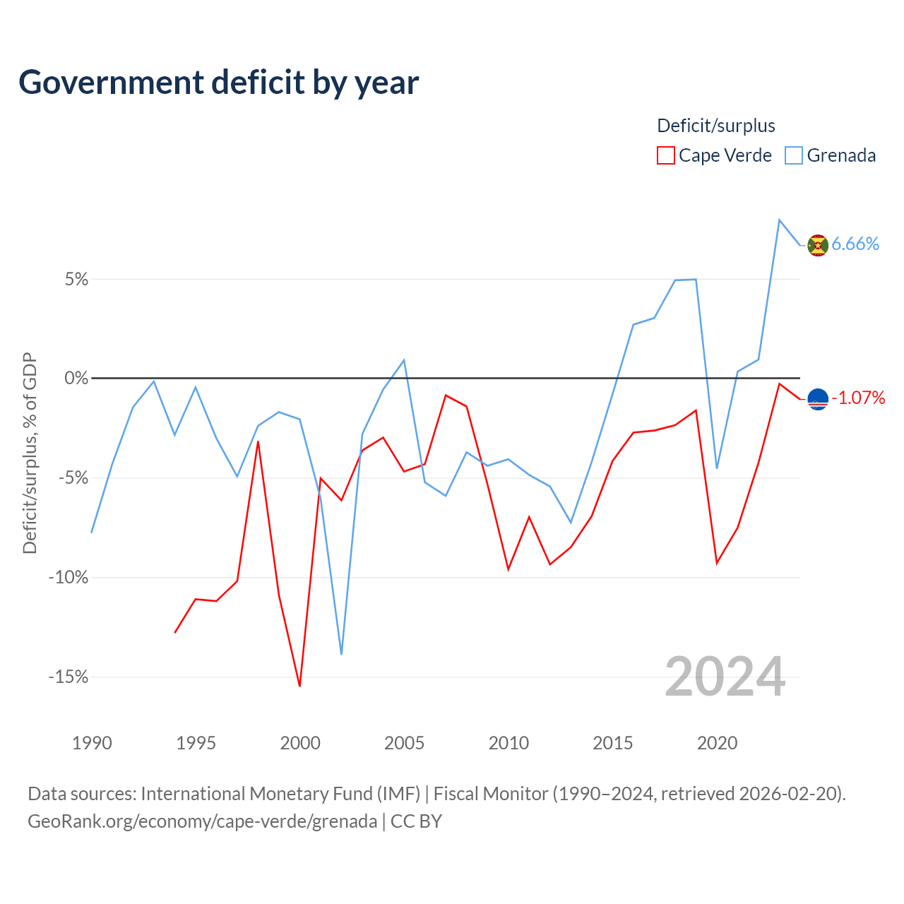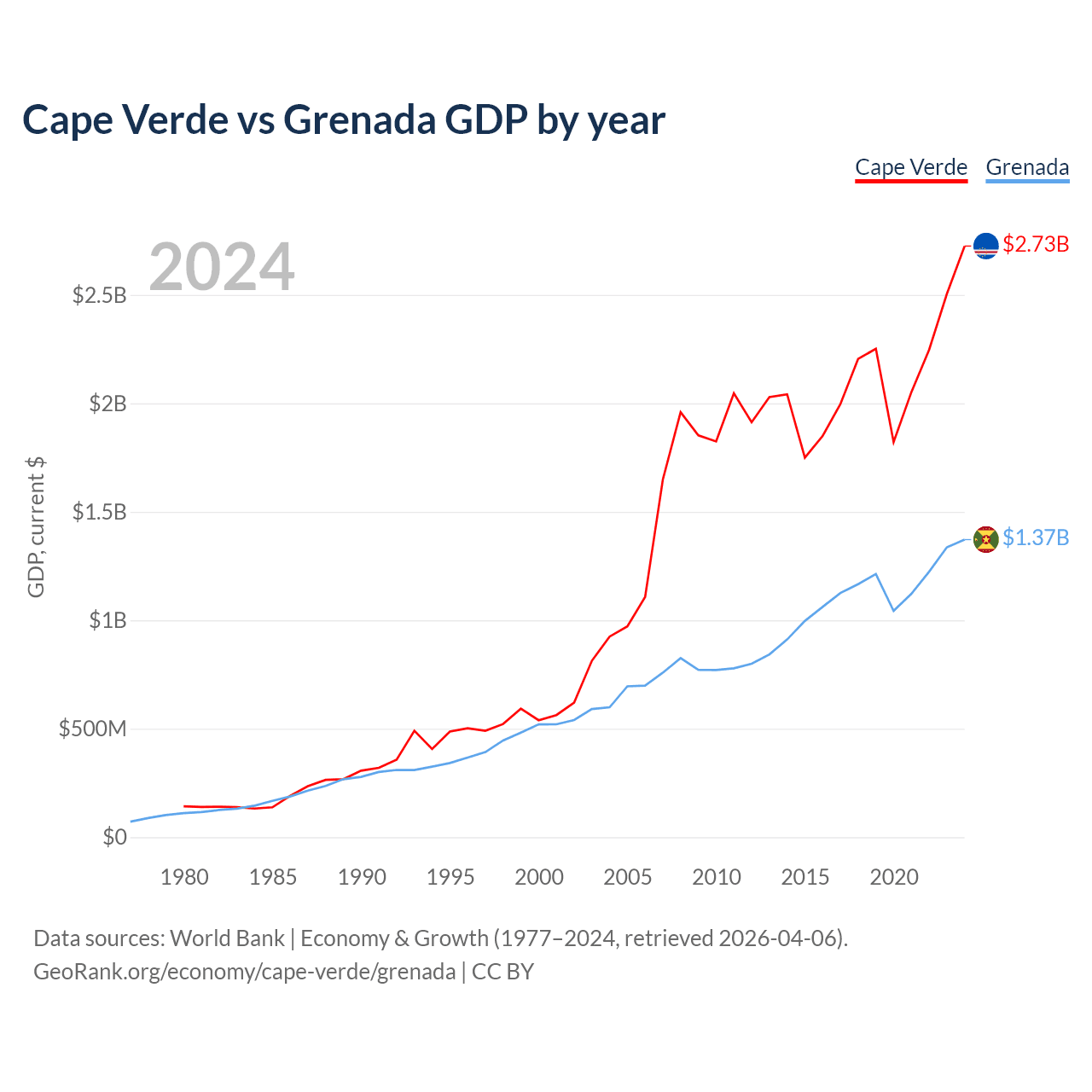 Cape Verde has a GDP of $2.73B compared to $1.37B for Grenada, ranking 172/197 and 184/197 by economy size, respectively.