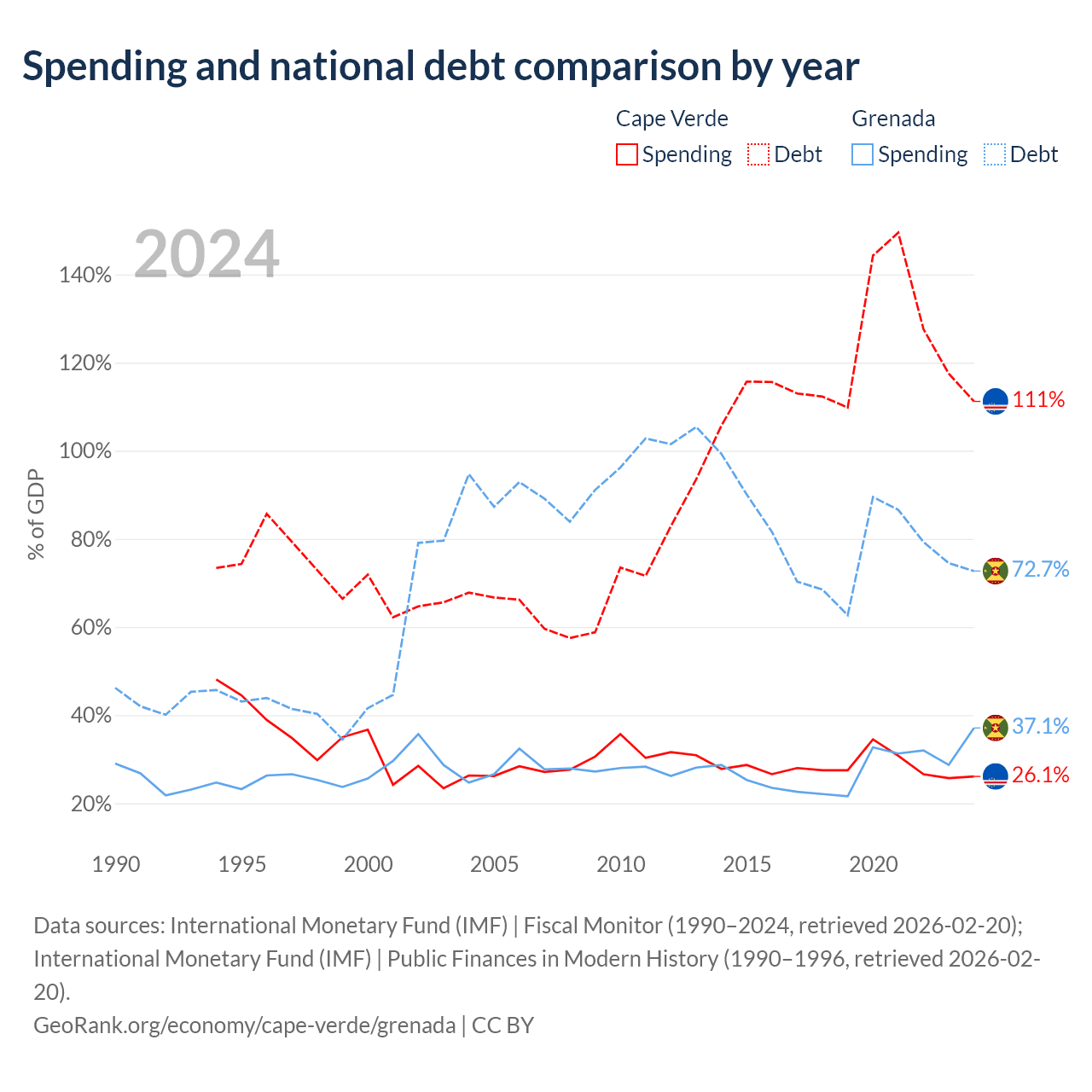 Cape Verde has $3.03B in government debt (111.2% of GDP), compared to $997M (72.7% of GDP) in Grenada.