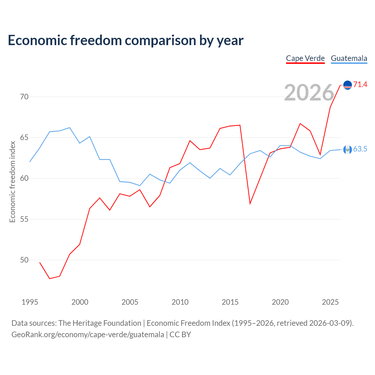 The Economic Freedom Index for Cape Verde is 71.4, ranking 32/197, compared to 63.5 for Guatemala, ranking 79/197. The chart above displays a comparison of annual changes in economic freedom indexes.