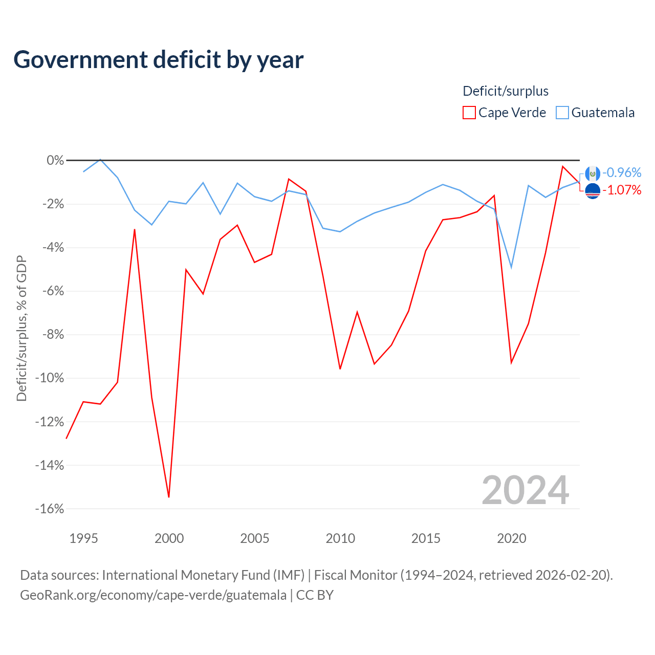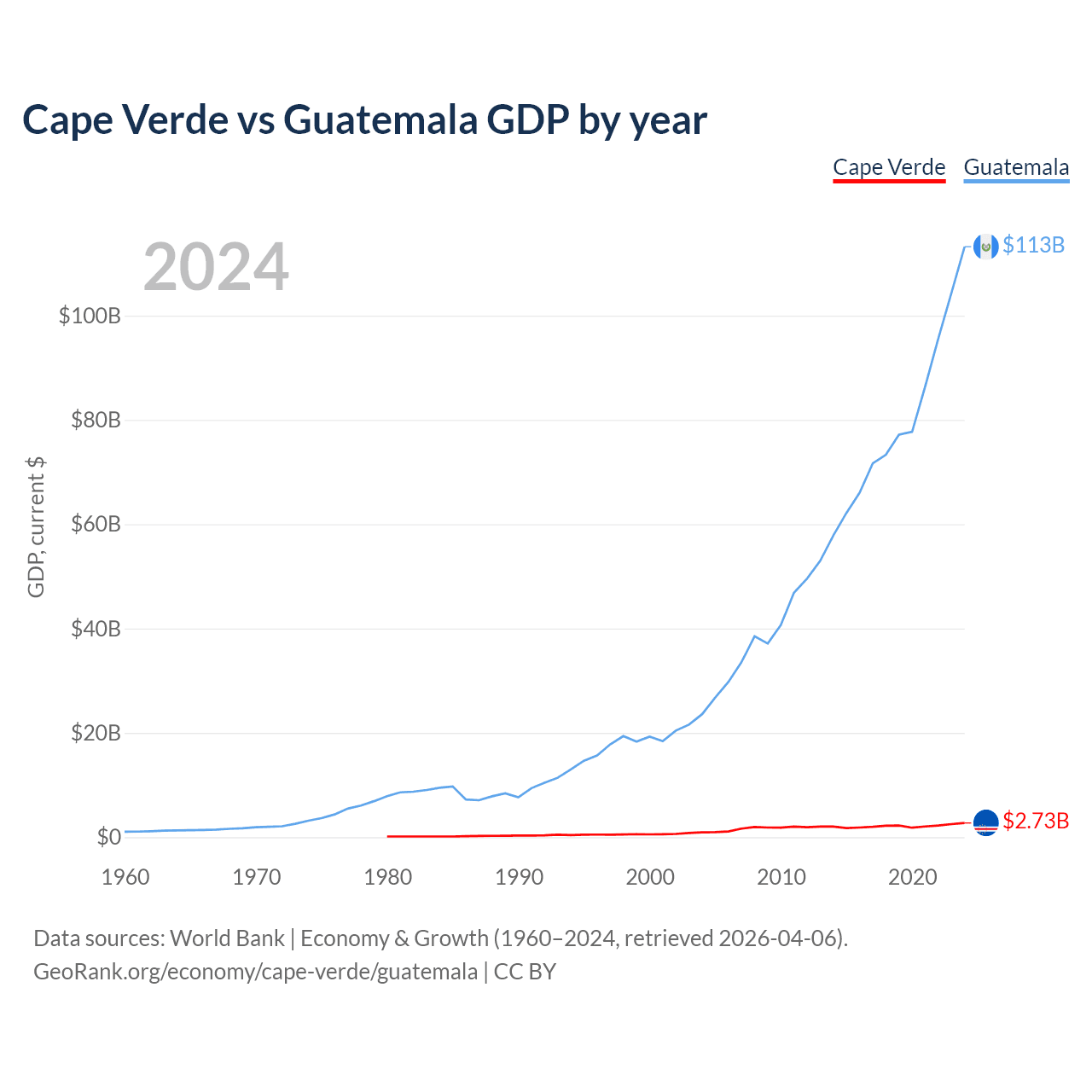 Cape Verde has a GDP of $2.73B compared to $113B for Guatemala, ranking 172/197 and 68/197 by economy size, respectively.