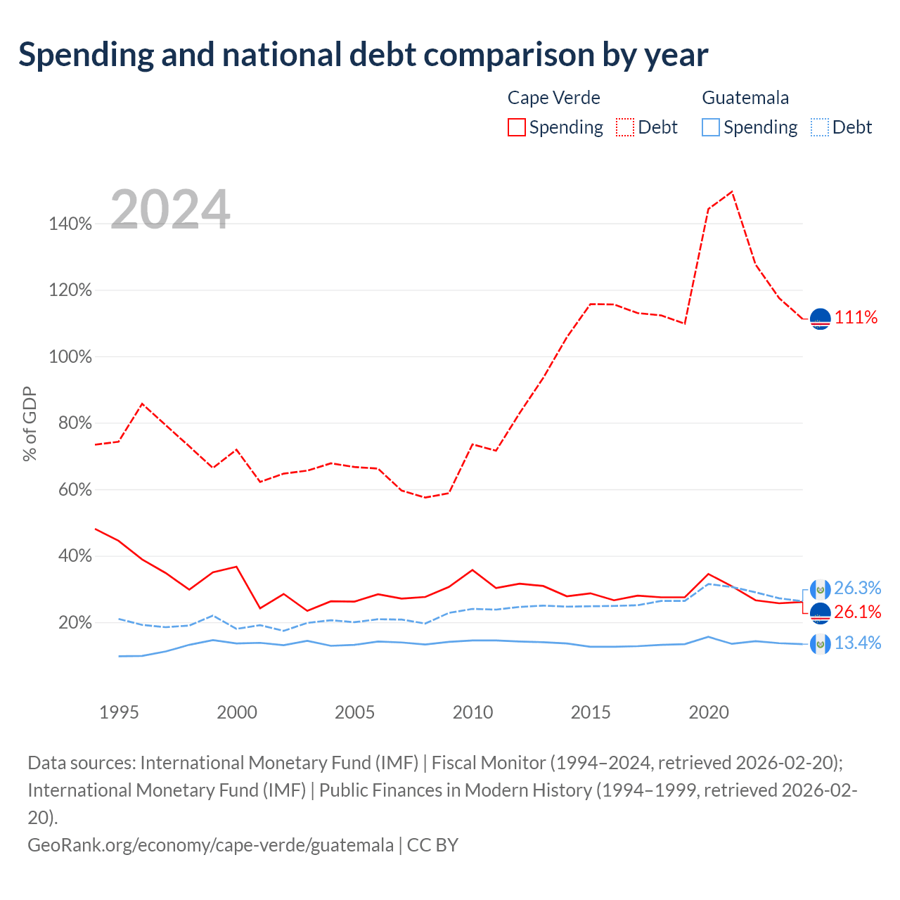Cape Verde has $3.03B in government debt (111.2% of GDP), compared to $29.8B (26.3% of GDP) in Guatemala.