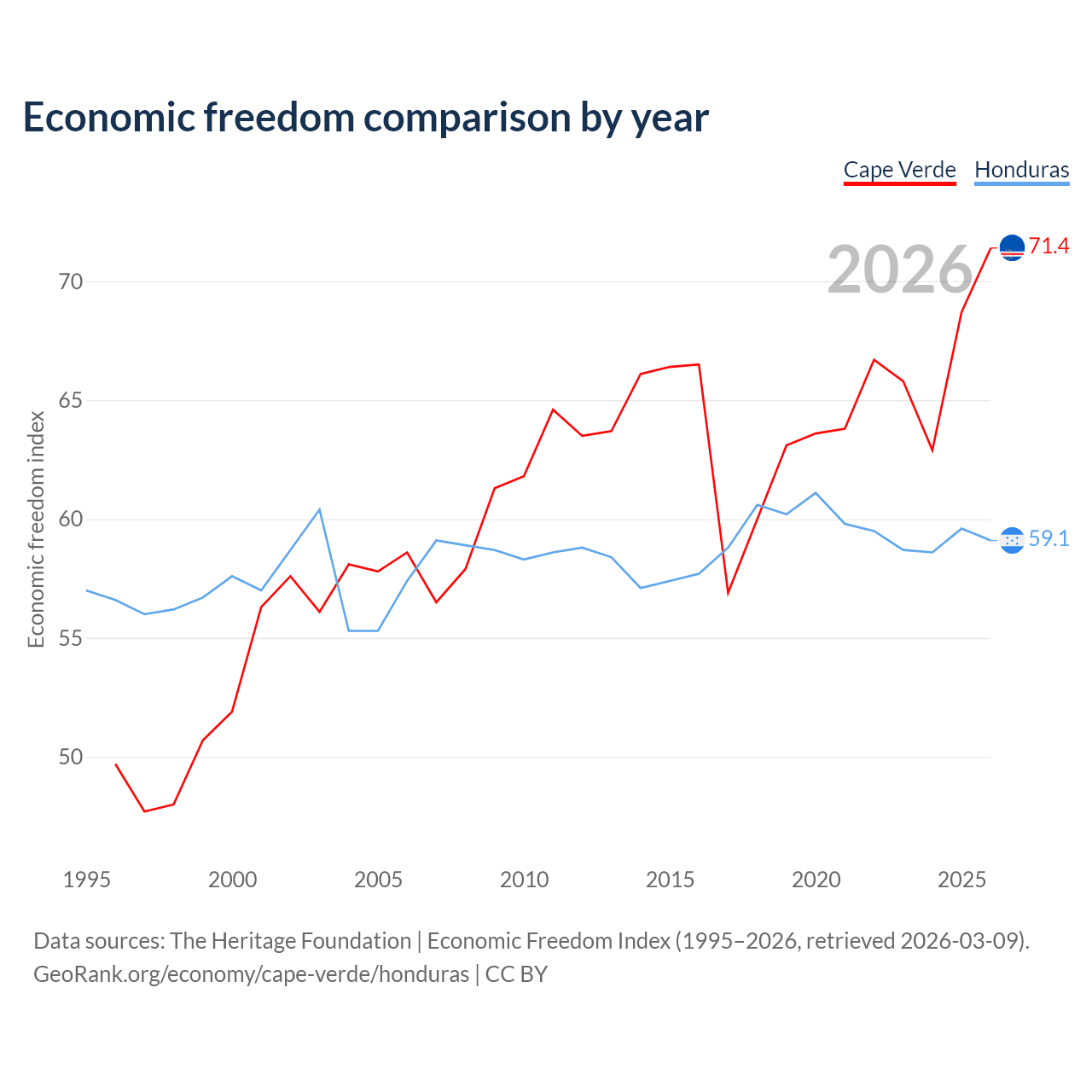 The Economic Freedom Index for Cape Verde is 71.4, ranking 32/197, compared to 59.1 for Honduras, ranking 105/197. The chart above displays a comparison of annual changes in economic freedom indexes.