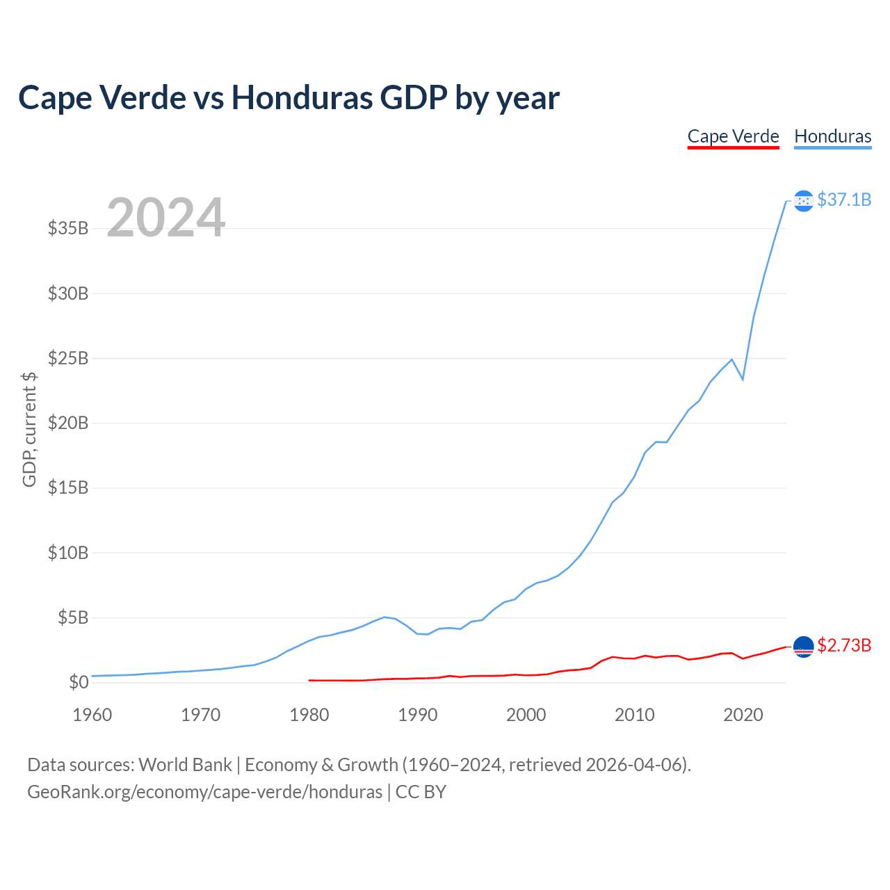 Cape Verde has a GDP of $2.73B compared to $37.1B for Honduras, ranking 172/197 and 104/197 by economy size, respectively.
