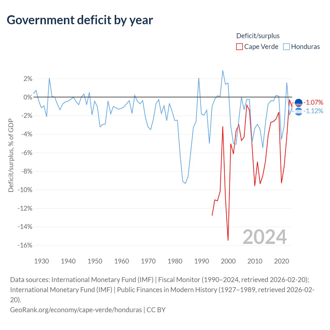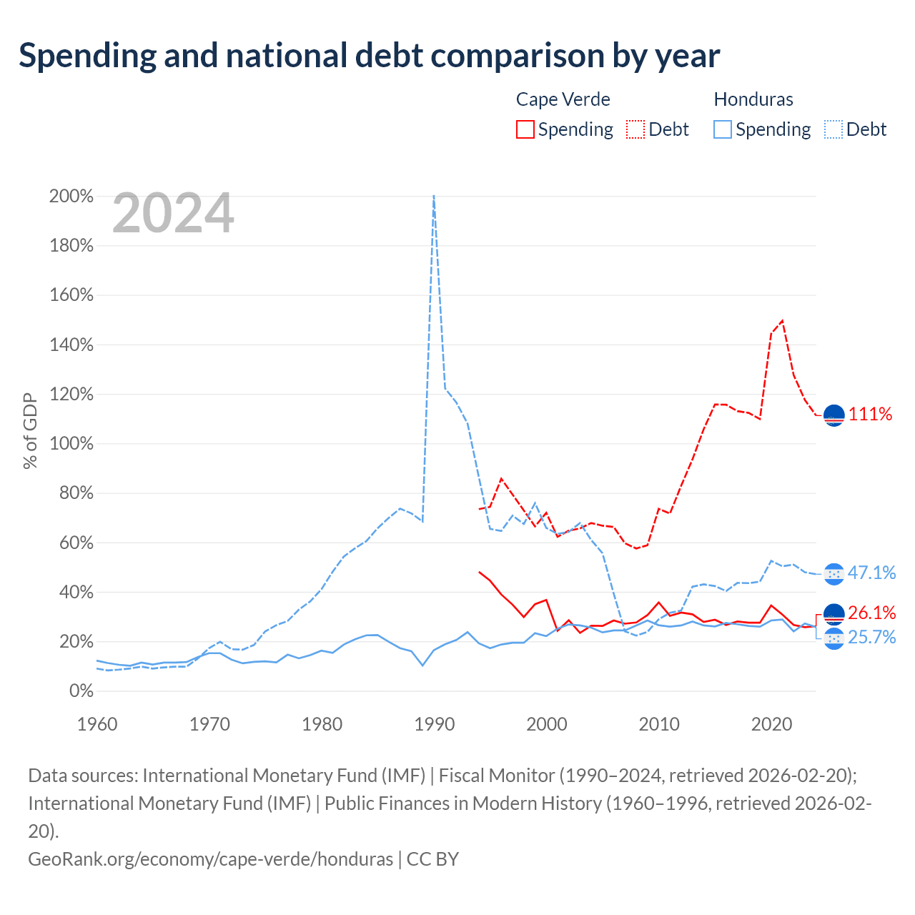 Cape Verde has $3.03B in government debt (111.2% of GDP), compared to $17.5B (47.1% of GDP) in Honduras.