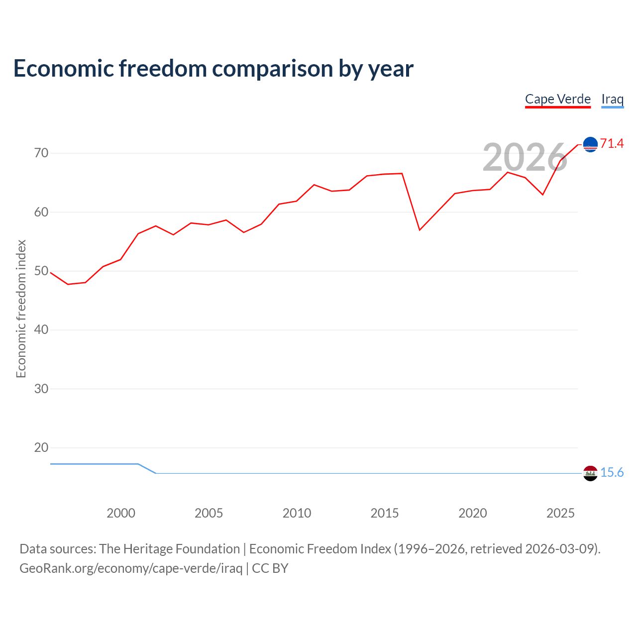 The Economic Freedom Index for Cape Verde is 71.4, ranking 32/197, compared to 15.6 for Iraq, ranking 196/197. The chart above displays a comparison of annual changes in economic freedom indexes.