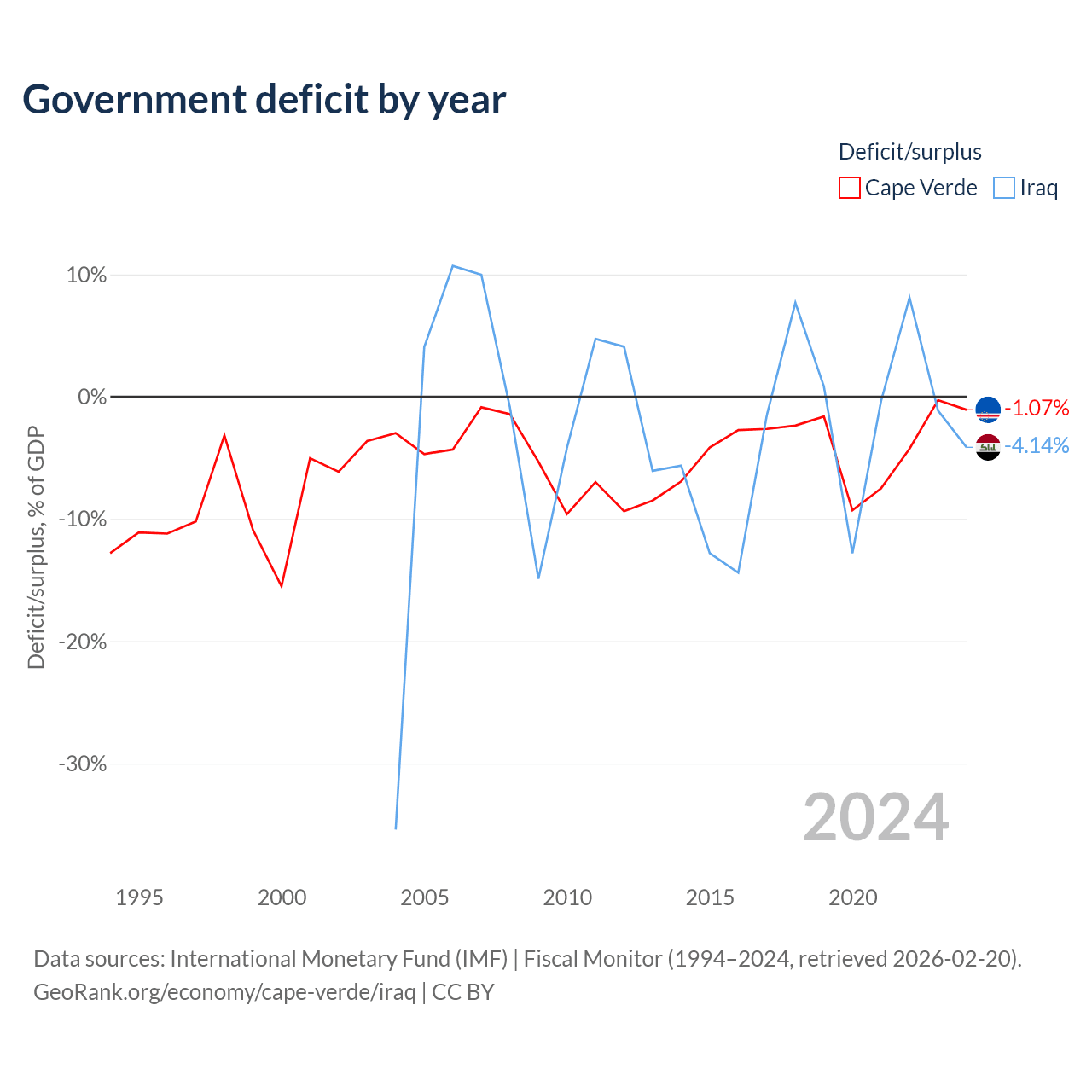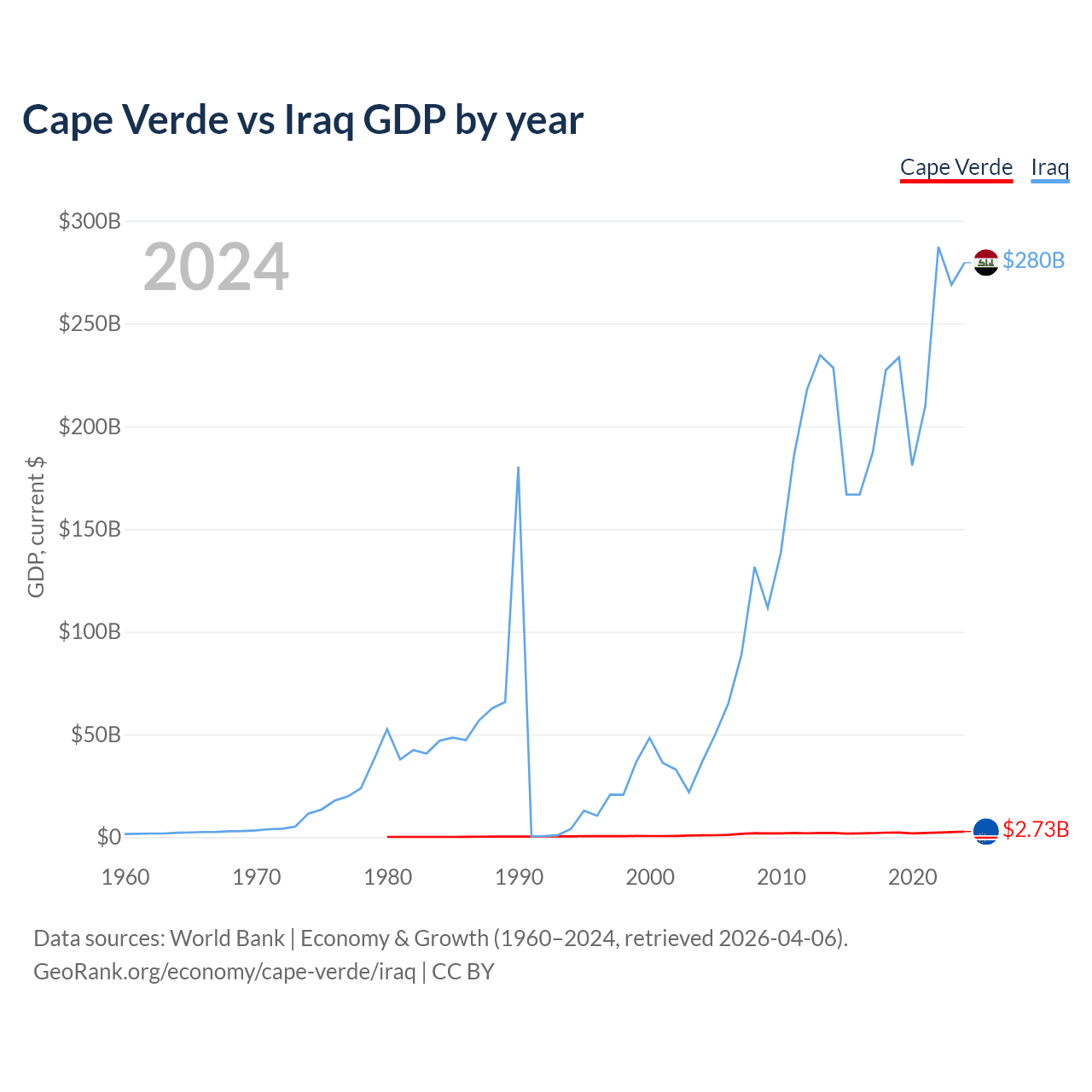 Cape Verde has a GDP of $2.73B compared to $280B for Iraq, ranking 172/197 and 50/197 by economy size, respectively.