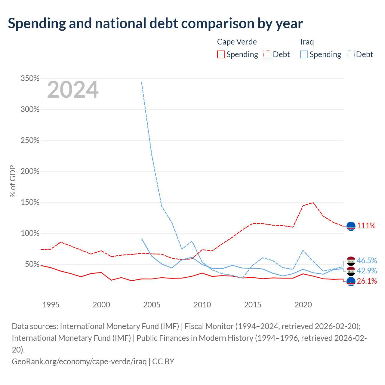 Cape Verde has $3.03B in government debt (111.2% of GDP), compared to $130B (46.5% of GDP) in Iraq.