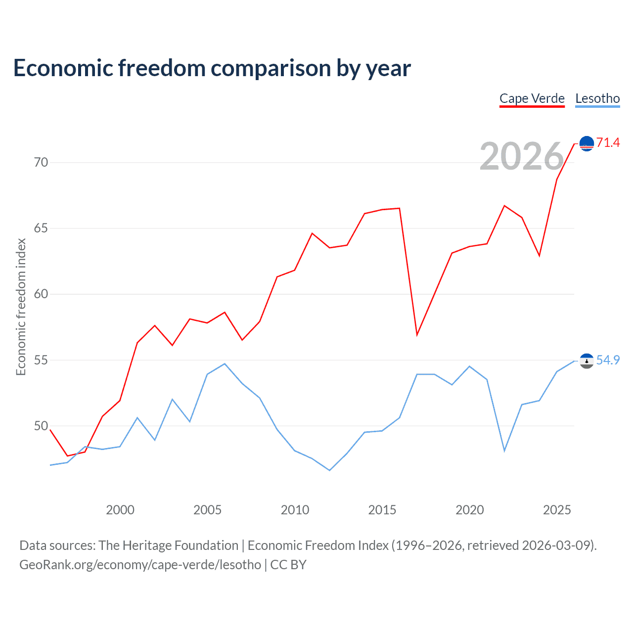 The Economic Freedom Index for Cape Verde is 71.4, ranking 32/197, compared to 54.9 for Lesotho, ranking 130/197. The chart above displays a comparison of annual changes in economic freedom indexes.
